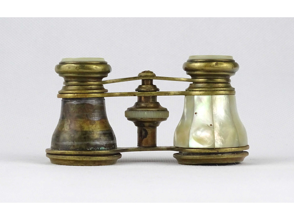 Nagyon régi, szép állapotú, réz testű színházi távcső, látcső, kukker, csiszolt kagyló, gyöngyház berakással. Az egyik csövéről hiányzik a gyöngyház.