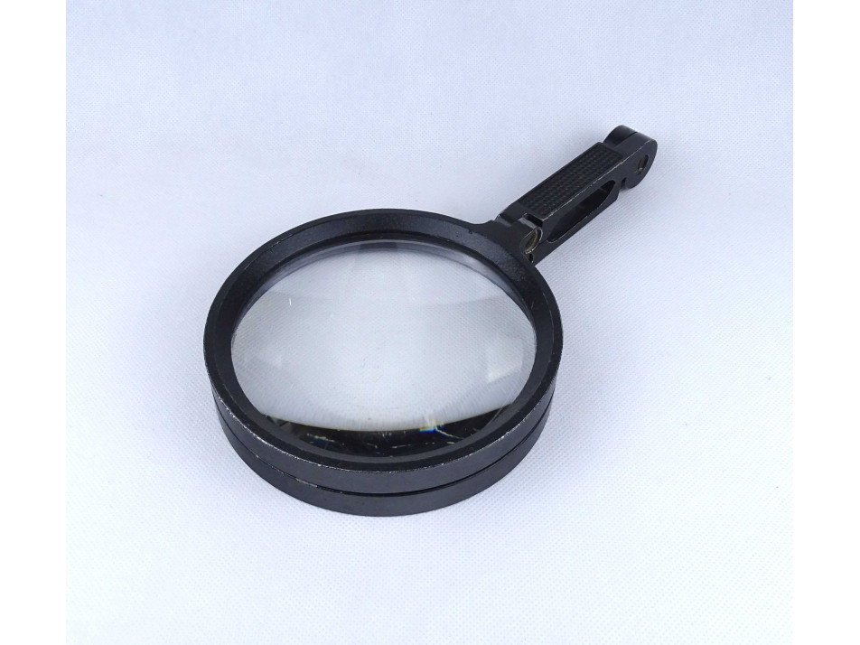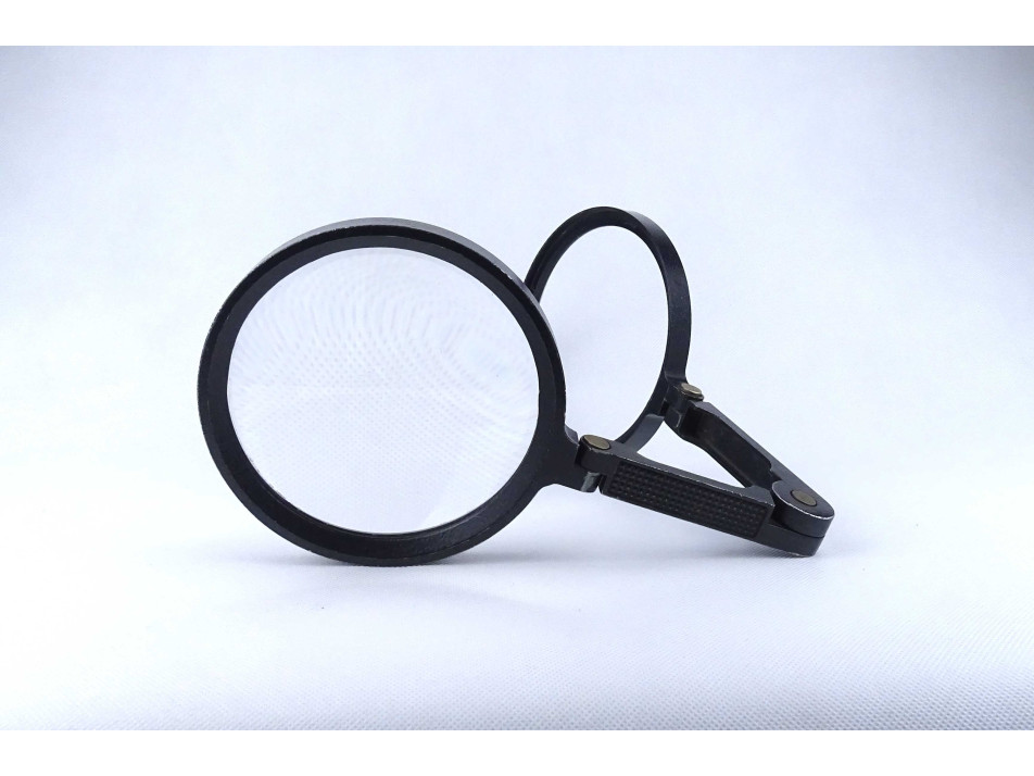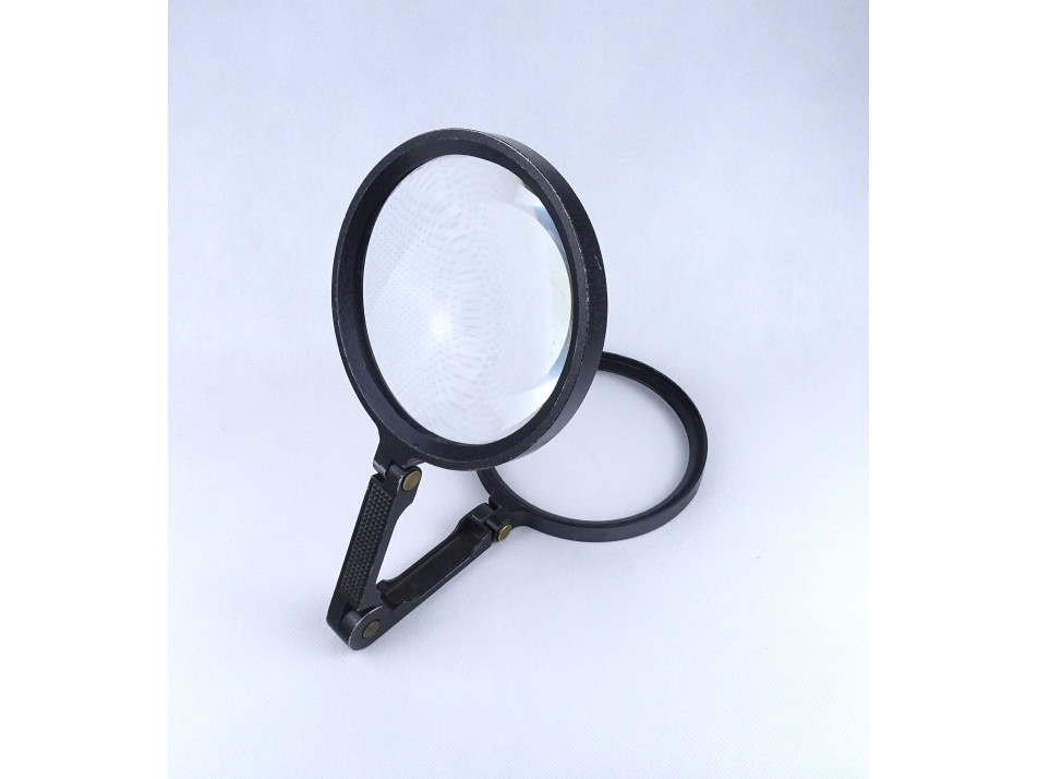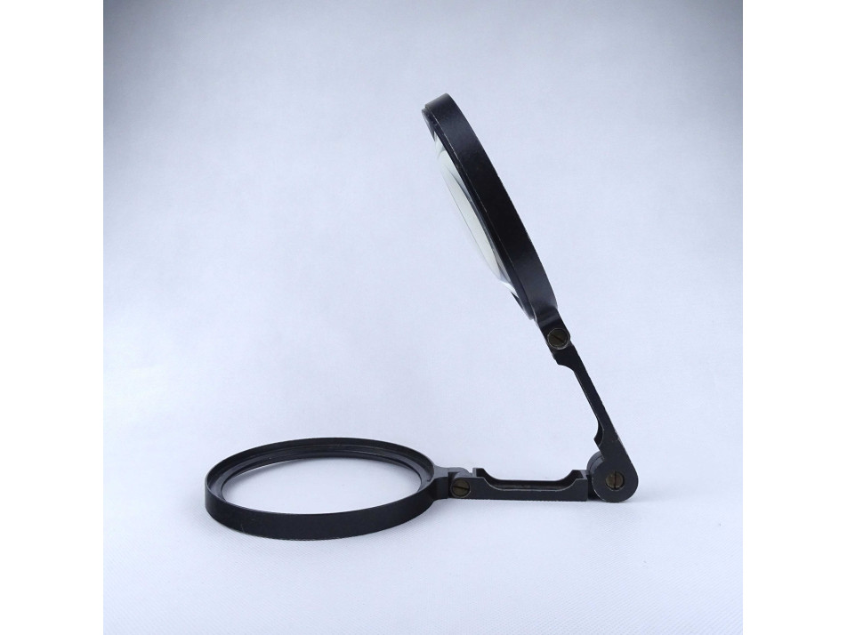 Régi, szép állapotú, összecsukható, alumínium állványos asztali nagyító. A nagyító állványának festése kopott, a lencsén több karcolás található.