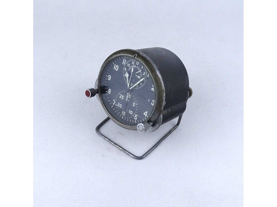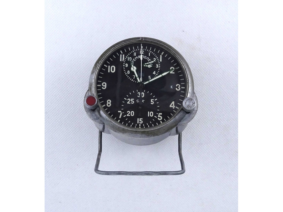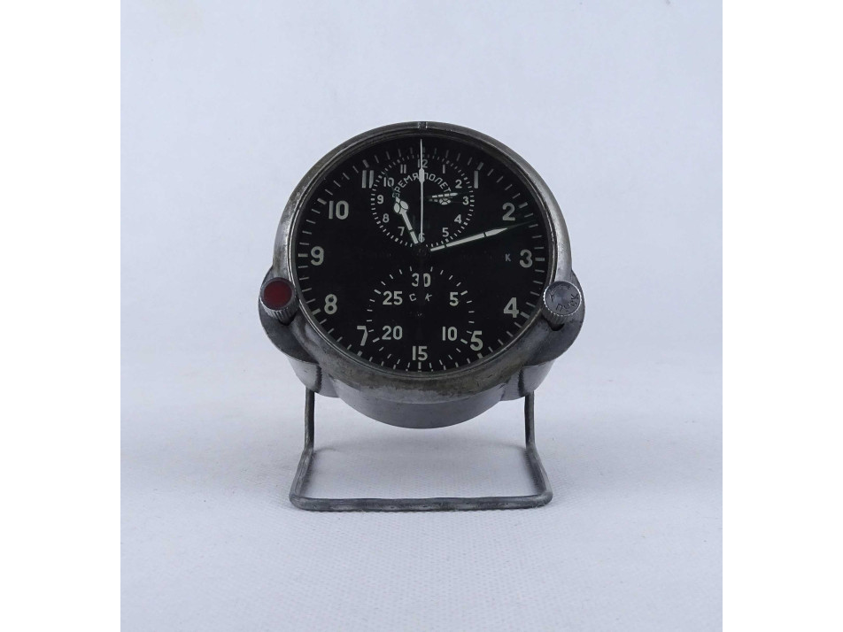 Régi orosz Repülőgép-fedélzeti mérő műszer, fedélzeti óra, fém álványon, működő állapotban. ACsSz-1MK repülőgép fedélzeti kronográf.