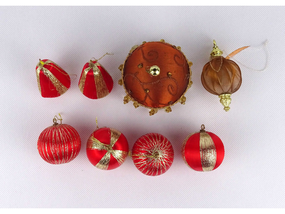Főoldal » Karácsonyi termékeink » Retro textil borítású vörös-arany és barna-arany színű karácsonyfadísz csomag 8 darab