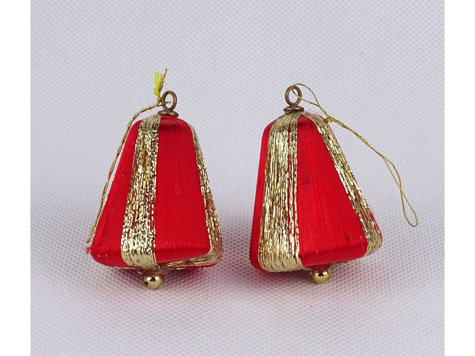 Retro, szép állapotú, vörös-arany és barna-arany színű, textil borítású műanyag karácsonyfadísz csomag, gömb és harang alakú díszek egy csomagban, 8 darab.