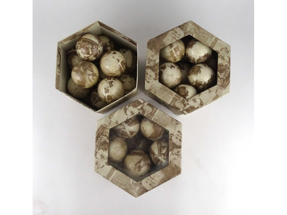 Régi, Mikulás dekorral díszített, krém színű, papír borítású hungarocell gömbökből álló karácsonyfadísz csomag. 35 darab dísz 3 darab hatszögletű dobozban.