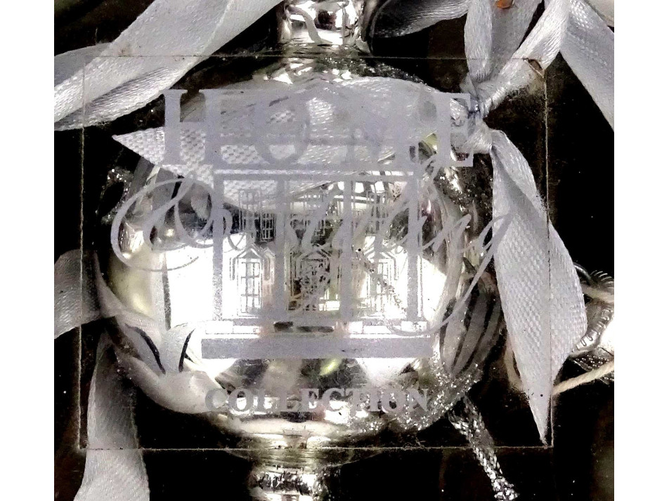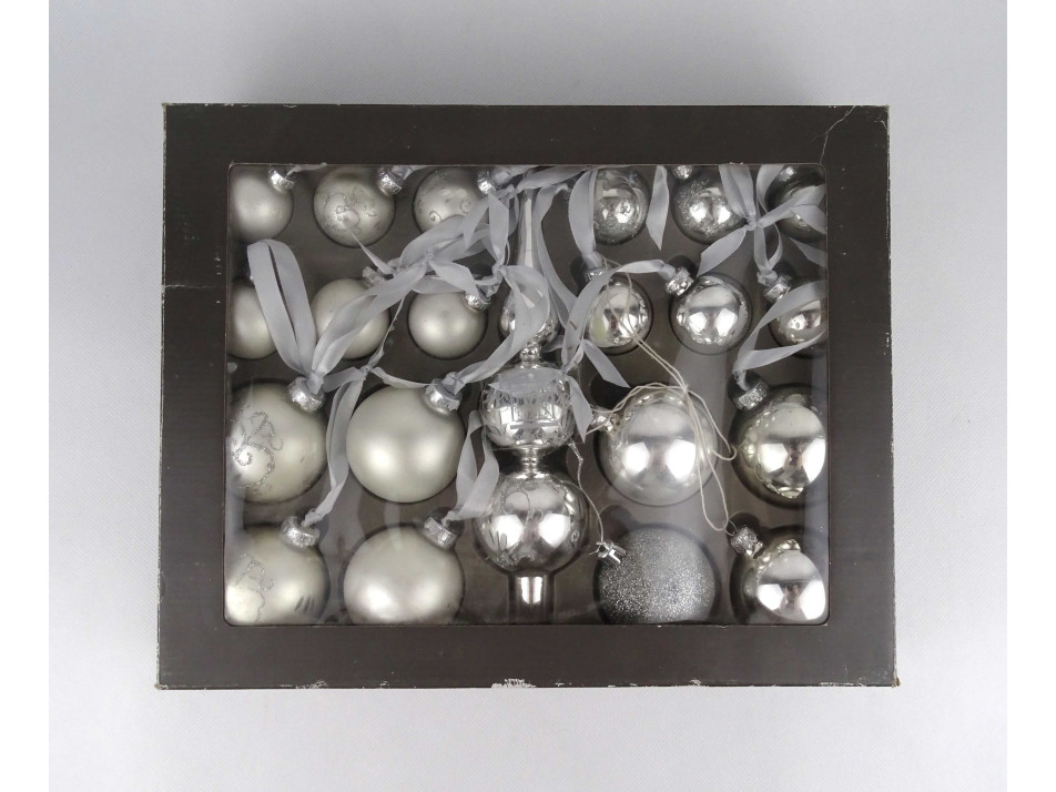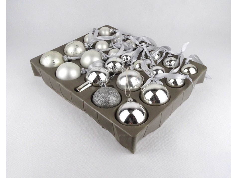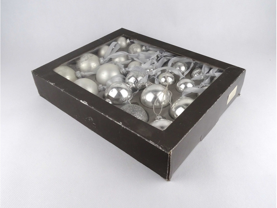 Régi, szép állapotú, ezüst színű üveg karácsonyfadísz, üvegdísz csomag, 21 darab egyben, eredeti papír dobozában.