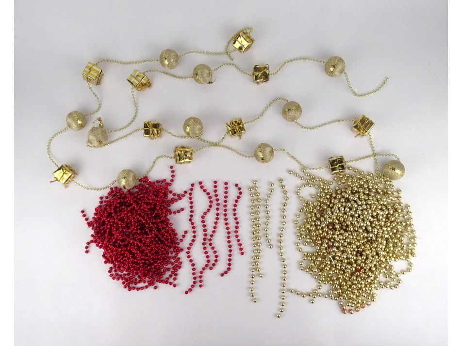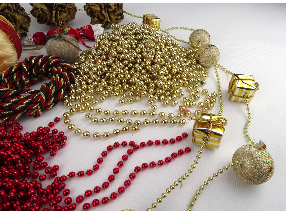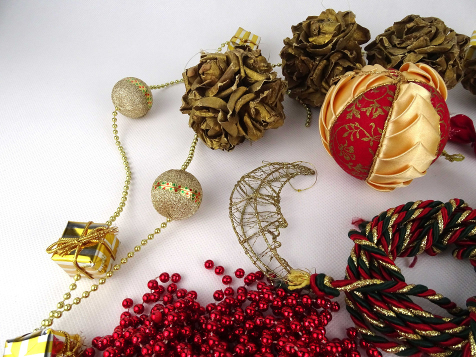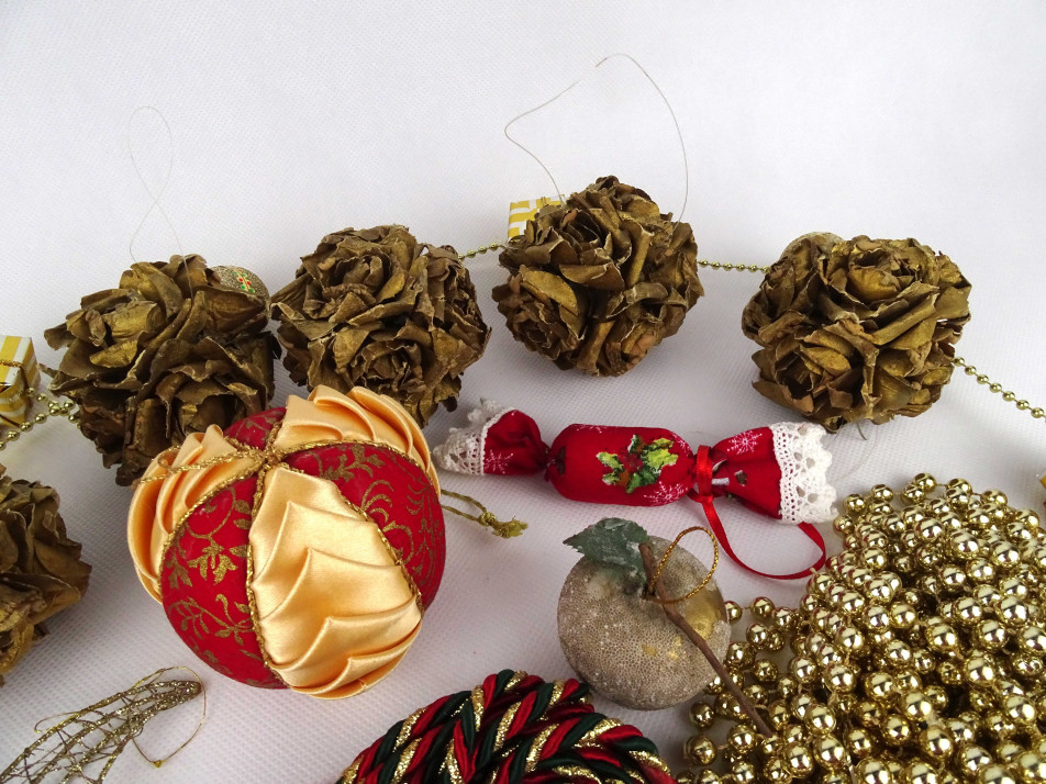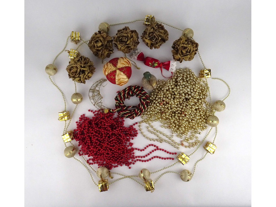 Szép állapotú, piros és arany színű, karácsonyfadíszek, papír, textíl és műanyag díszek és girlandok. Vegyes csomag, 13 darab egyben.