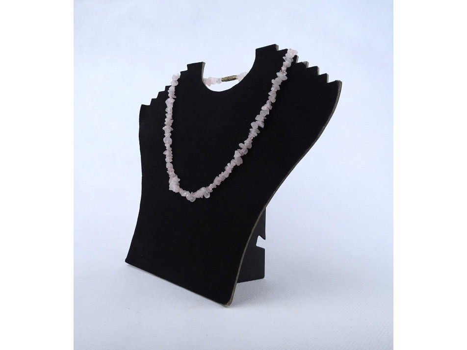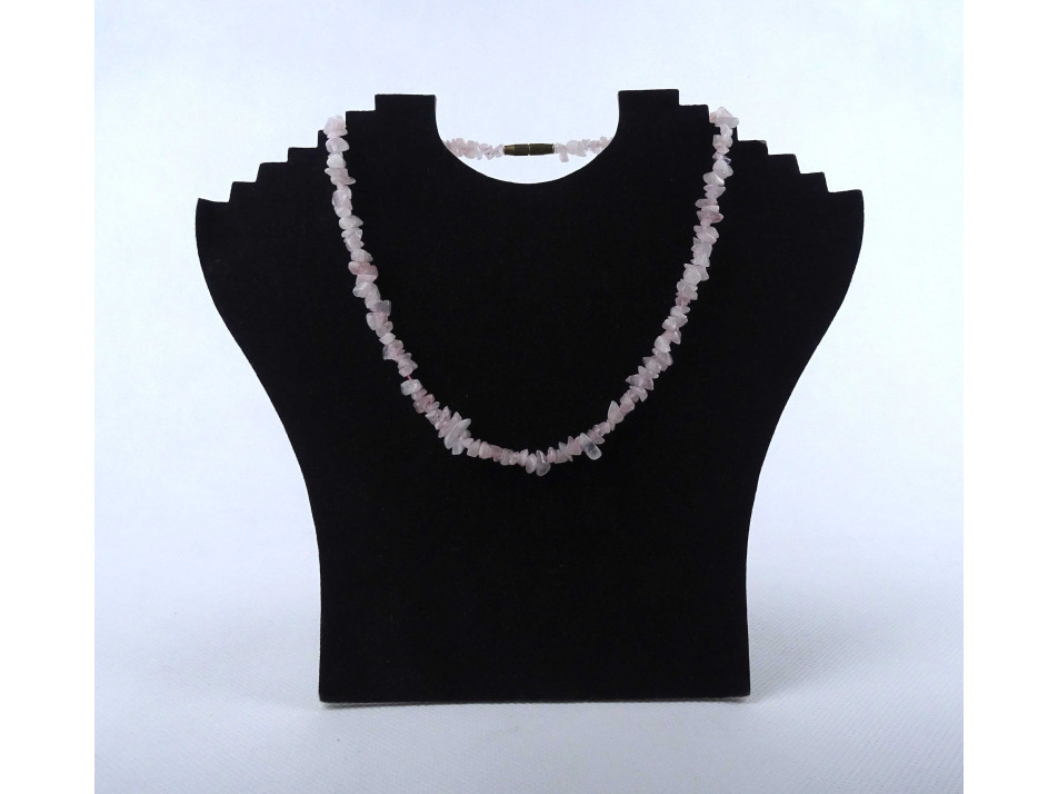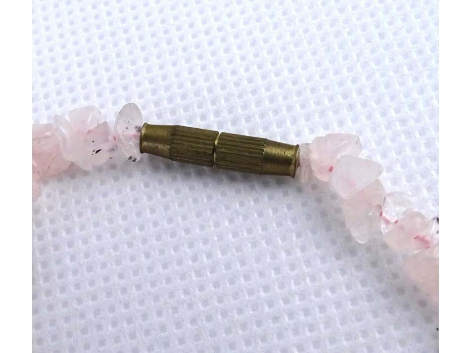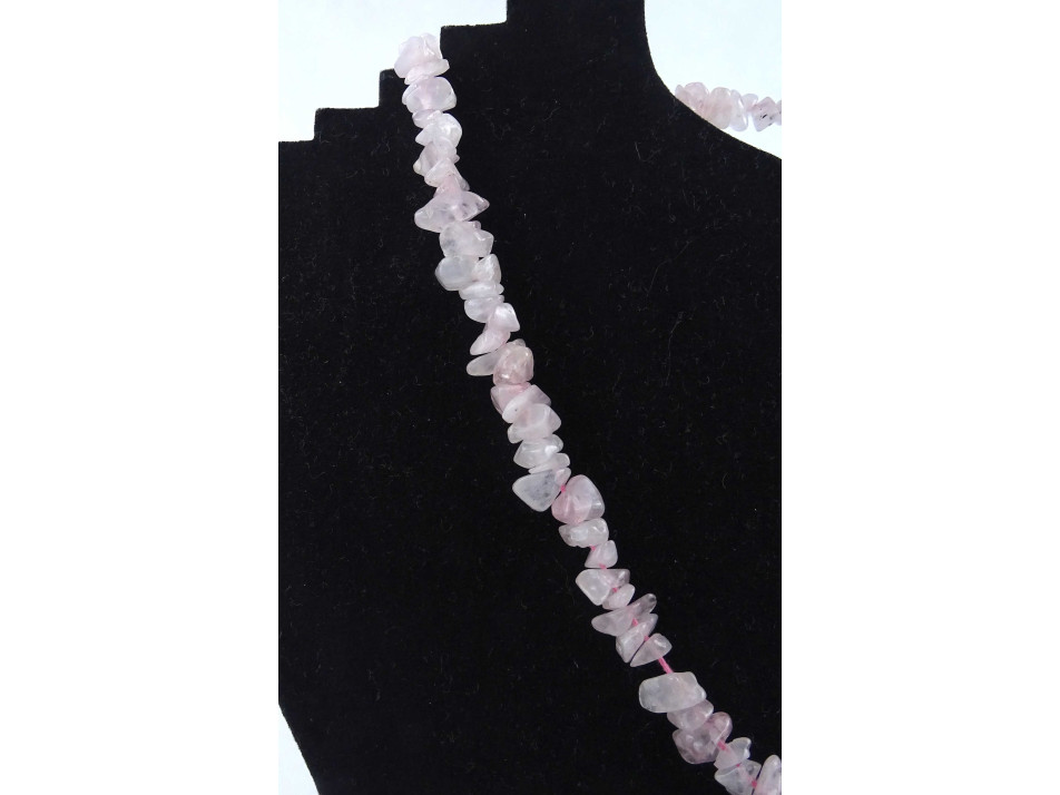 Hibátlan állapotú, szabálytalan alakú rózsaszín színű rózsakvarc ásványokból fűzött, csavaros csattal rendelkező bizsu ékszer, ásvány nyaklánc.