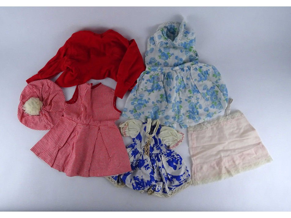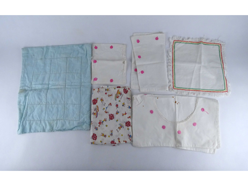 Régi, vegyes játékbaba ruha és játék ágynemű huzat csomag. Több darab foltos, sérült. Különböző méretű játék babákra lehetnek jók.