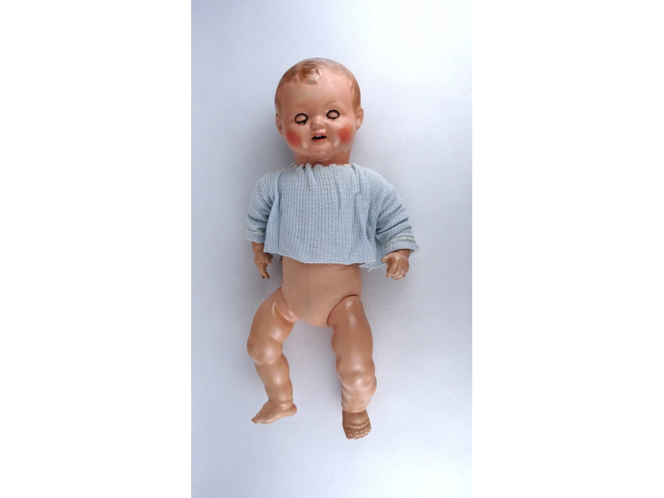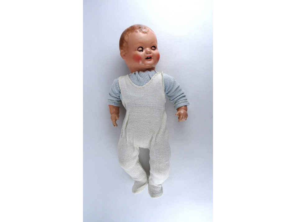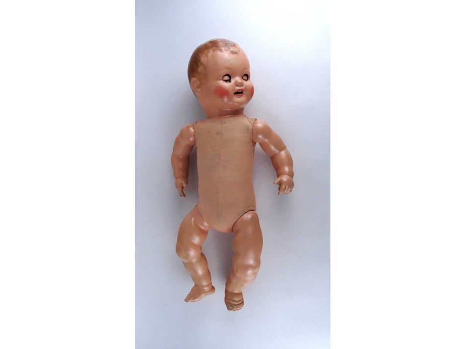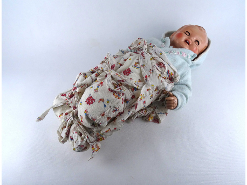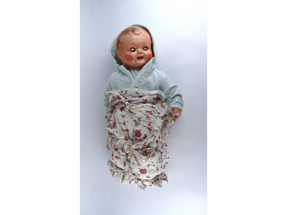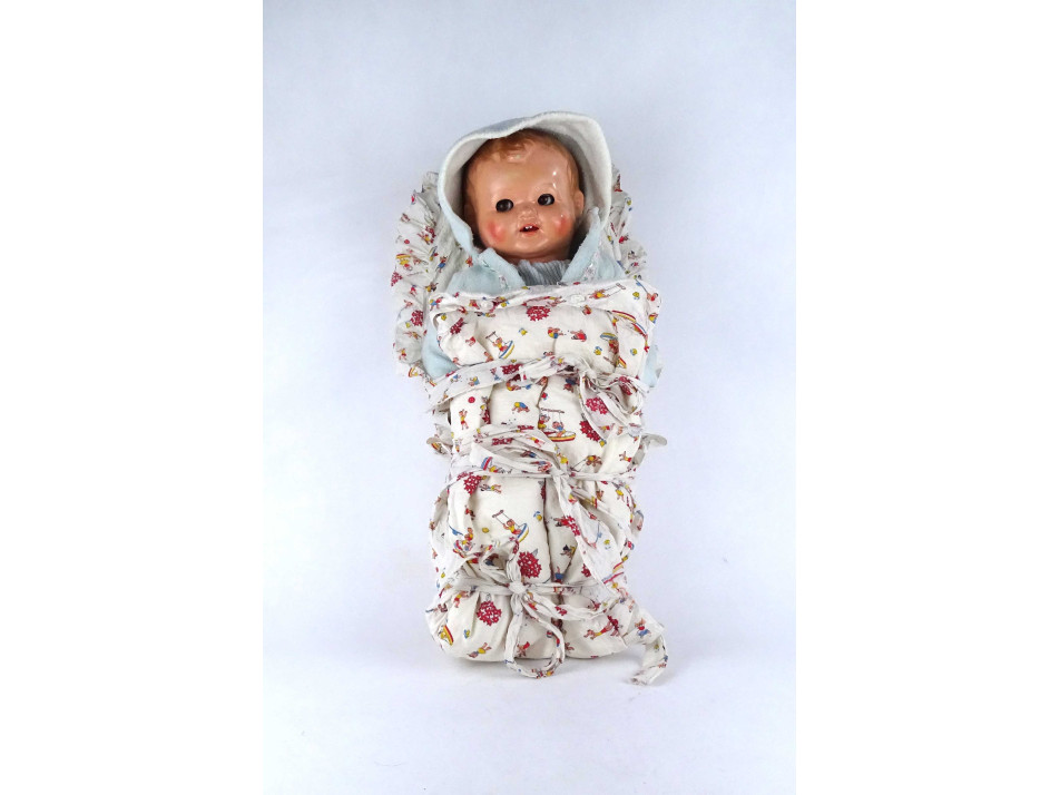 Régi, felruházott játékbaba, pólyával. Csukódó üvegszemei szépen működnek. Feje és végtagjai is festett papírmaséból készültek, teste textíl. A fején elöl kisebb sérülés, hátol egy javított törés nyomai láthatóak. Ruhái épek, szép állapotúak.