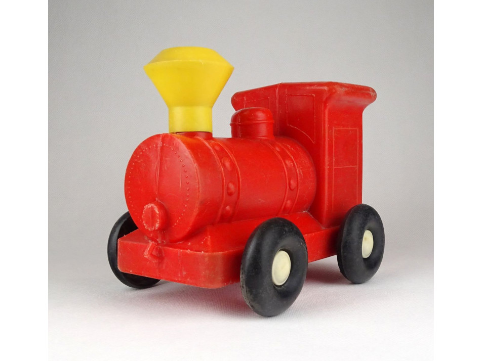 Régi, retro piros műanyag gyerekjáték gőzös az 1960-as, 70-es évekből. DMSZ fröccsöntött műanyag játék. Debreceni Műanyagipari Szövetkezet.