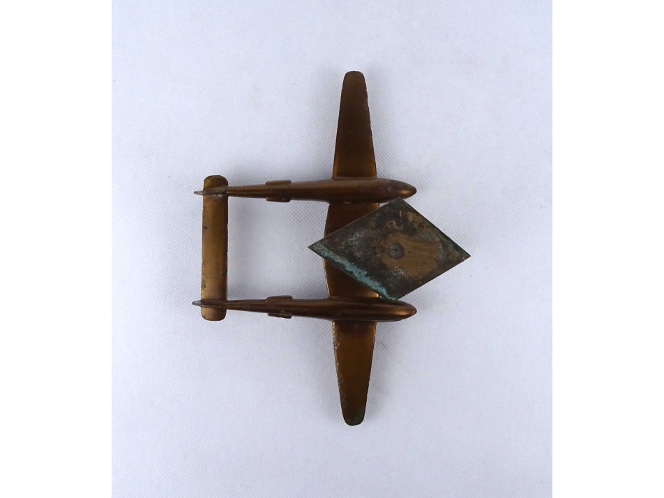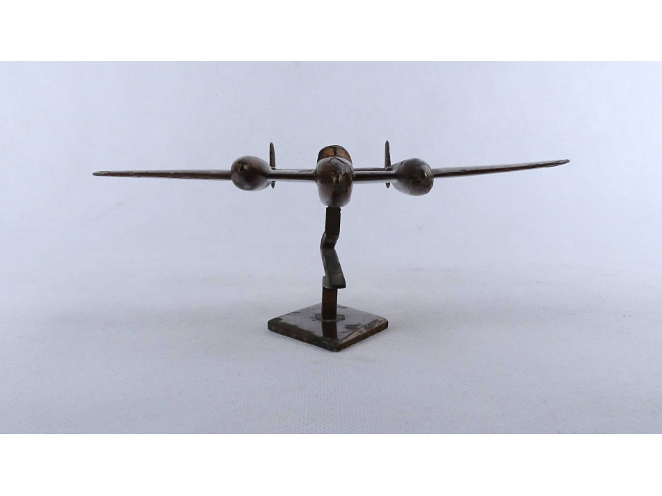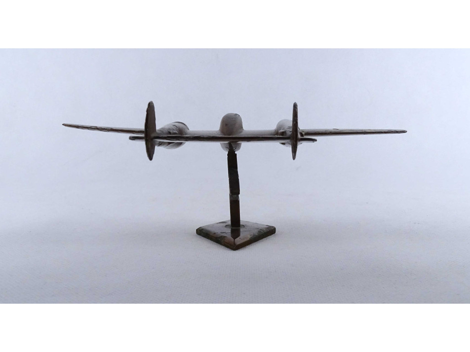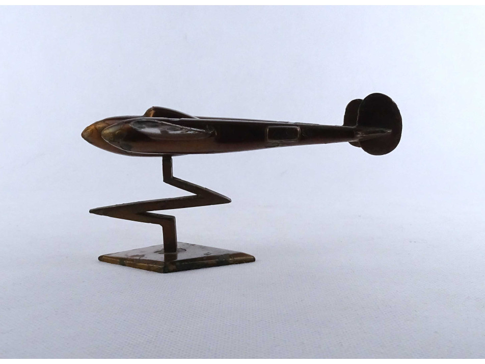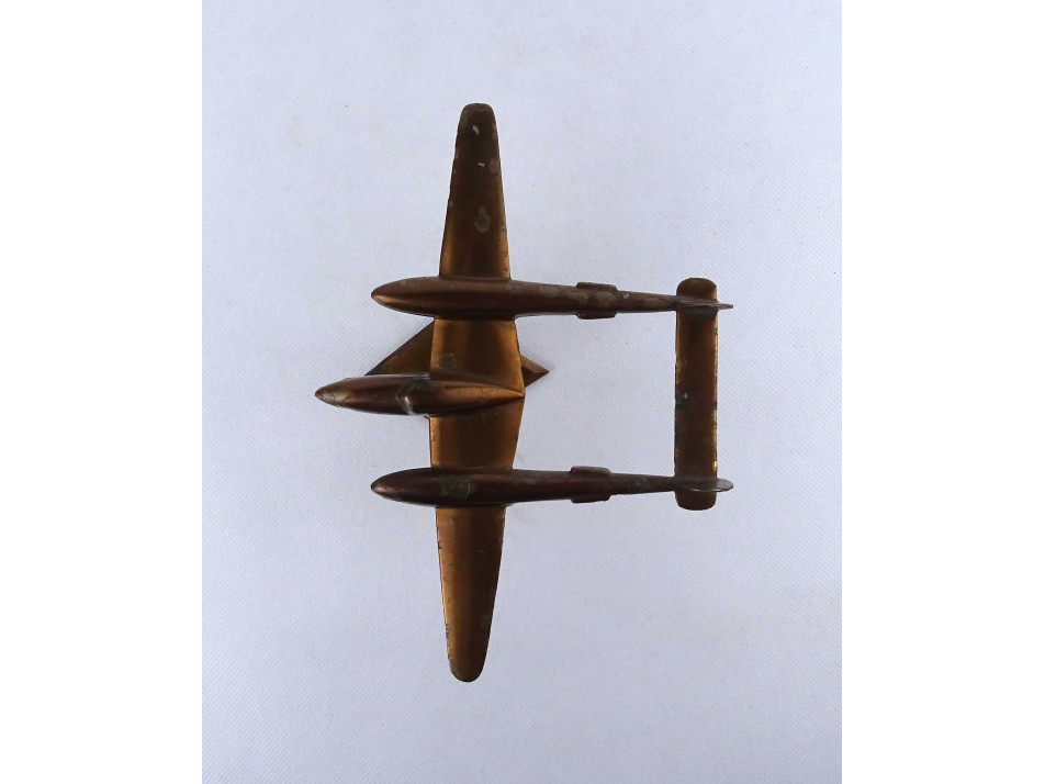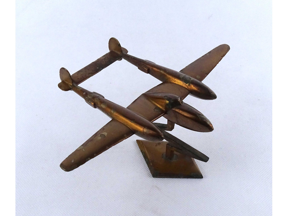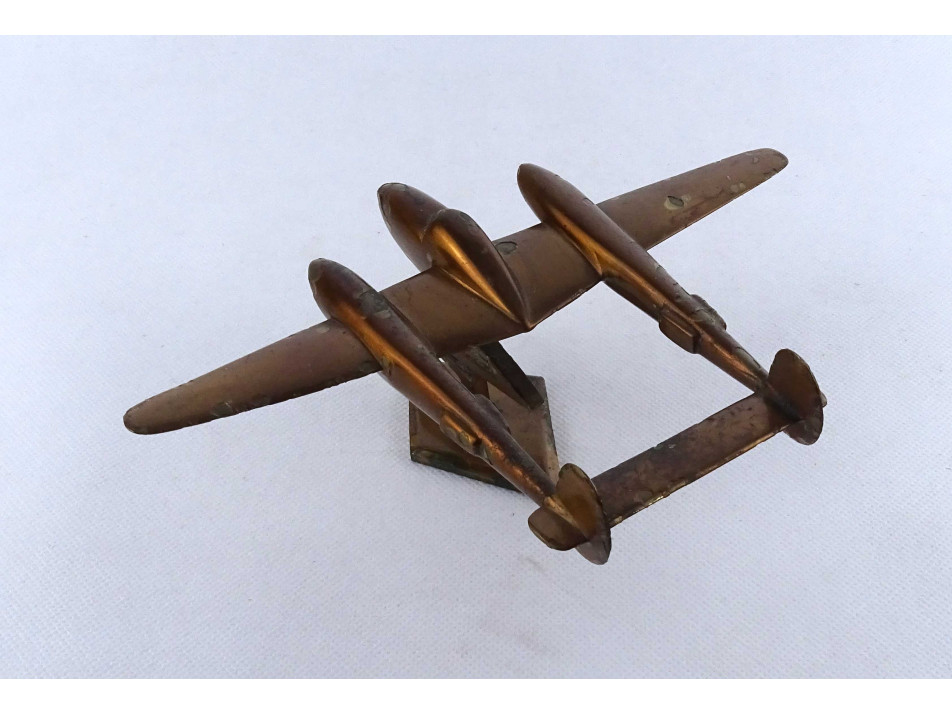 Régi, szép állapotú, bronzból öntött második világháborús P–38 Lightning vadászrepülőgép makett. Ez a típus az Amerikai Egyesült Államok légerejénél volt rendszeresítve a második világháború alatt. A makett testét lakkréteg borítja. Ez a réteg néhol hiányos, lepattogzott.