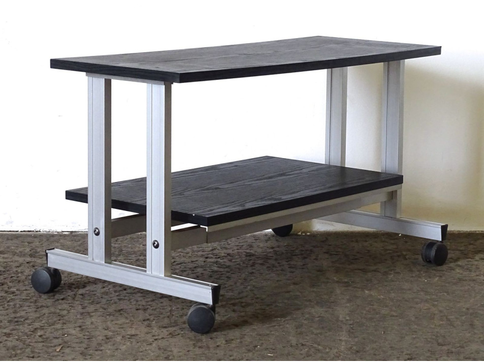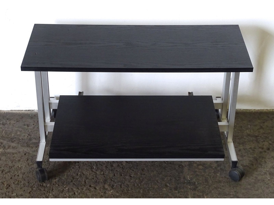 Fekete színű, gurulós bútor, tv-állvány. Erős, stabil alumínium vázon két polc, az alsó kihúzható.