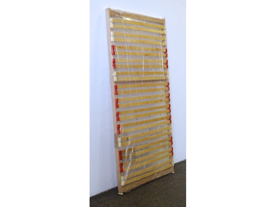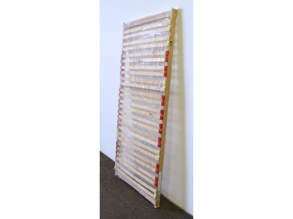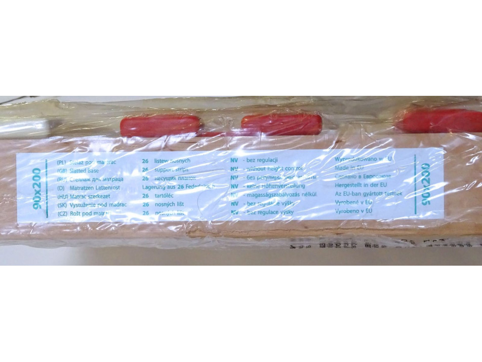 Bontatlan csomagolásában található fix keretes ágyrács, 26 rácsos. Feliratok: BASIC 200x90 CM ART. NO.: 3512532 9 KG