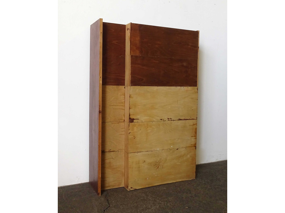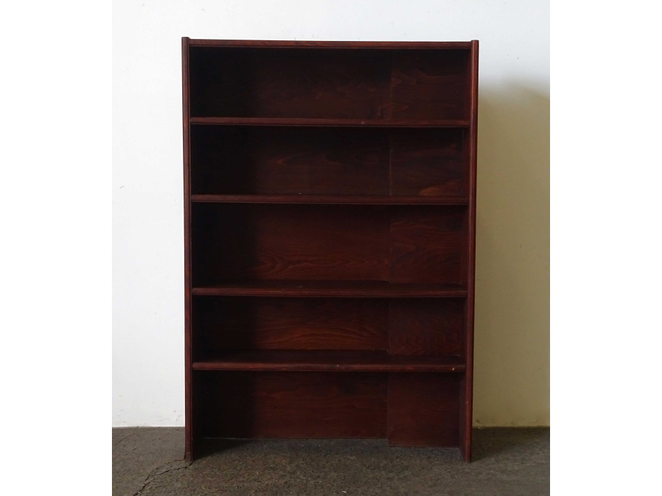 Szép, állapotú, régi, fábol készült könyvespolc, dolgozószoba berendezés. Benne 4 darab fix magasságú polc. A szekrény hátulján egyedi átalakítást végeztek. Egy oszlop, vagy kémény köré illesztkedhetett, így a polcok jobb oldala kisebb mélységű. Lásd fotó.