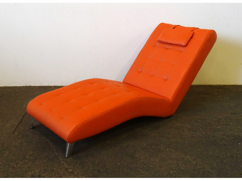 Újszerű állapotú, modern formavilágú, narancssárga műbőr borítású relax fotel, fekvőfotel.
