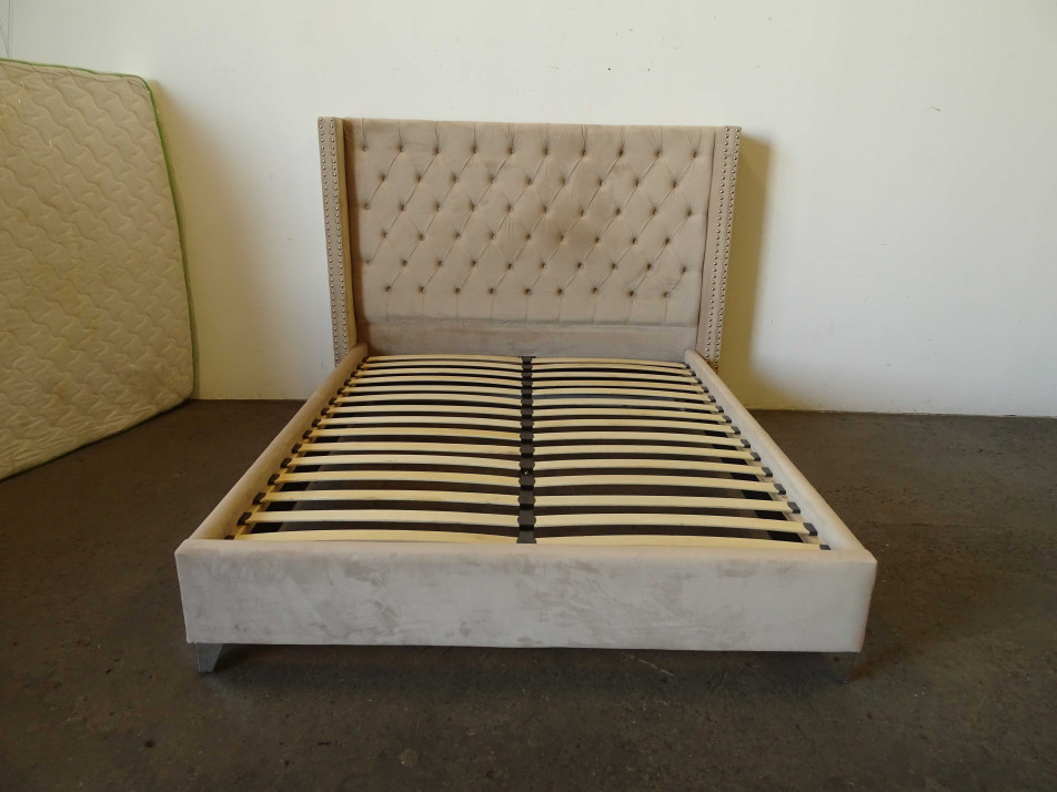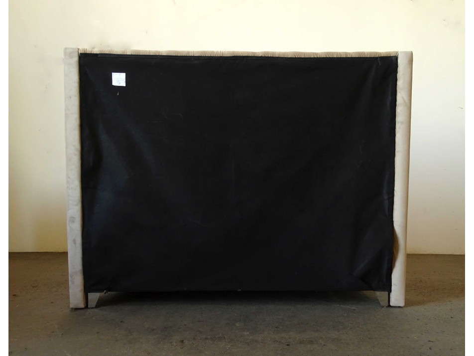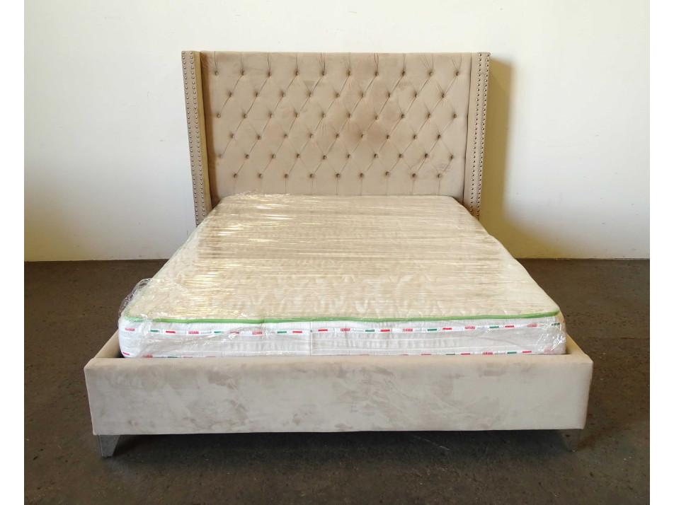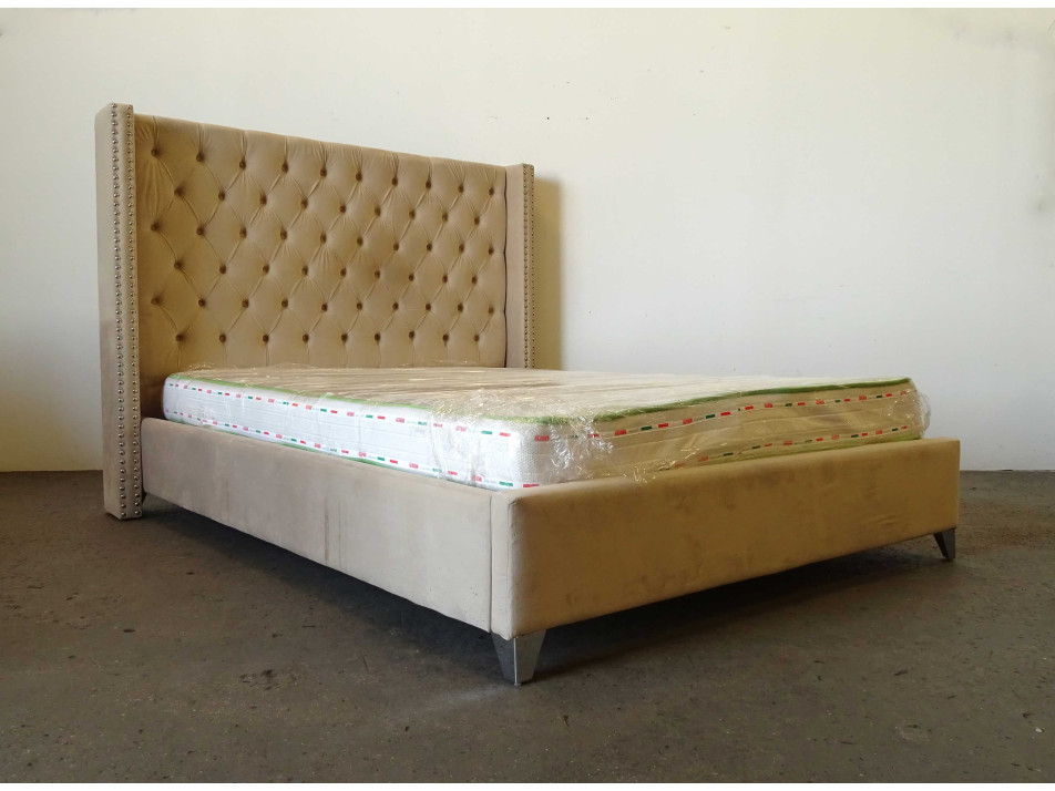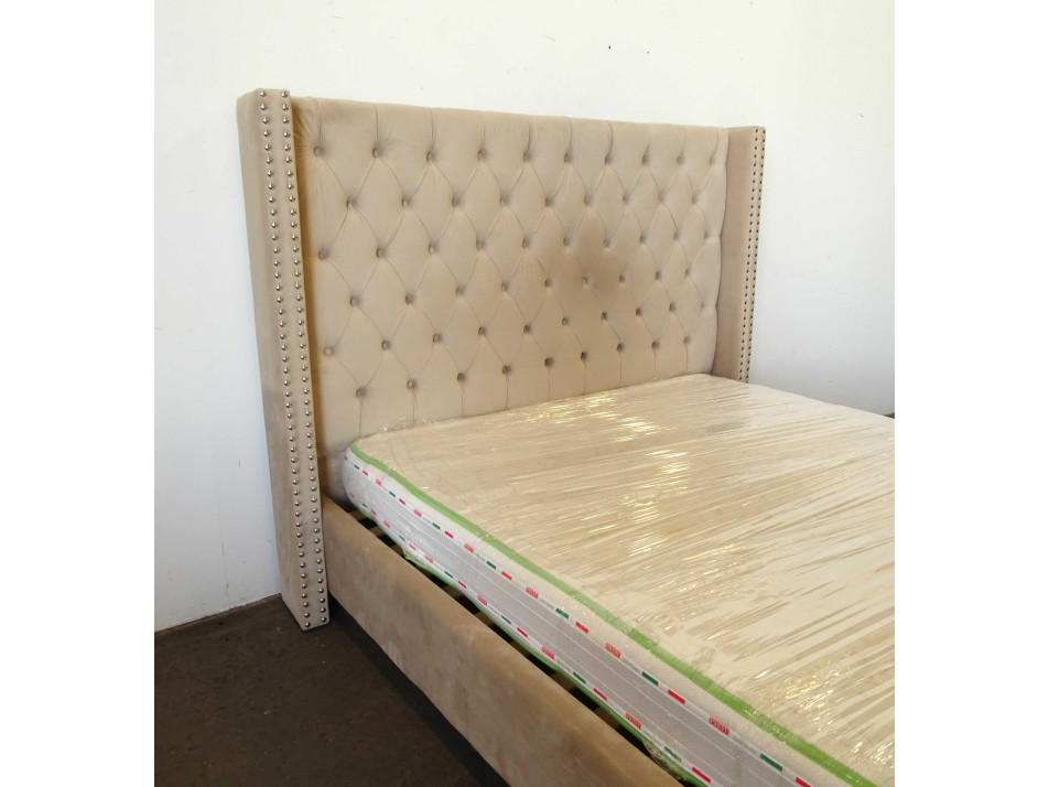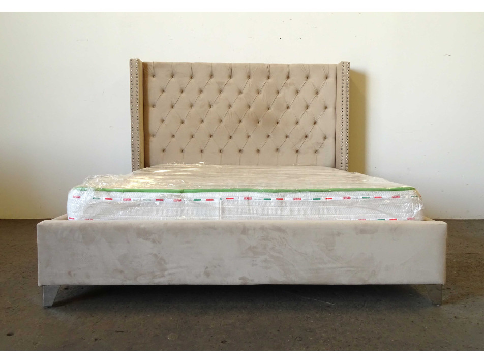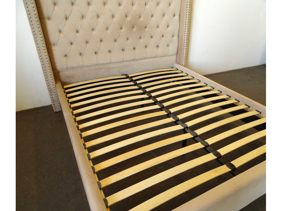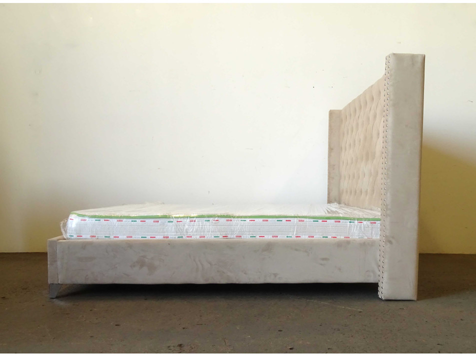 Modern, drapp színű kárpittal bevont, tűzött kárpitozású franciaágy magas fejvéggel. Az ágy elemekre szedhető a könnyebb szállítás érdekében.