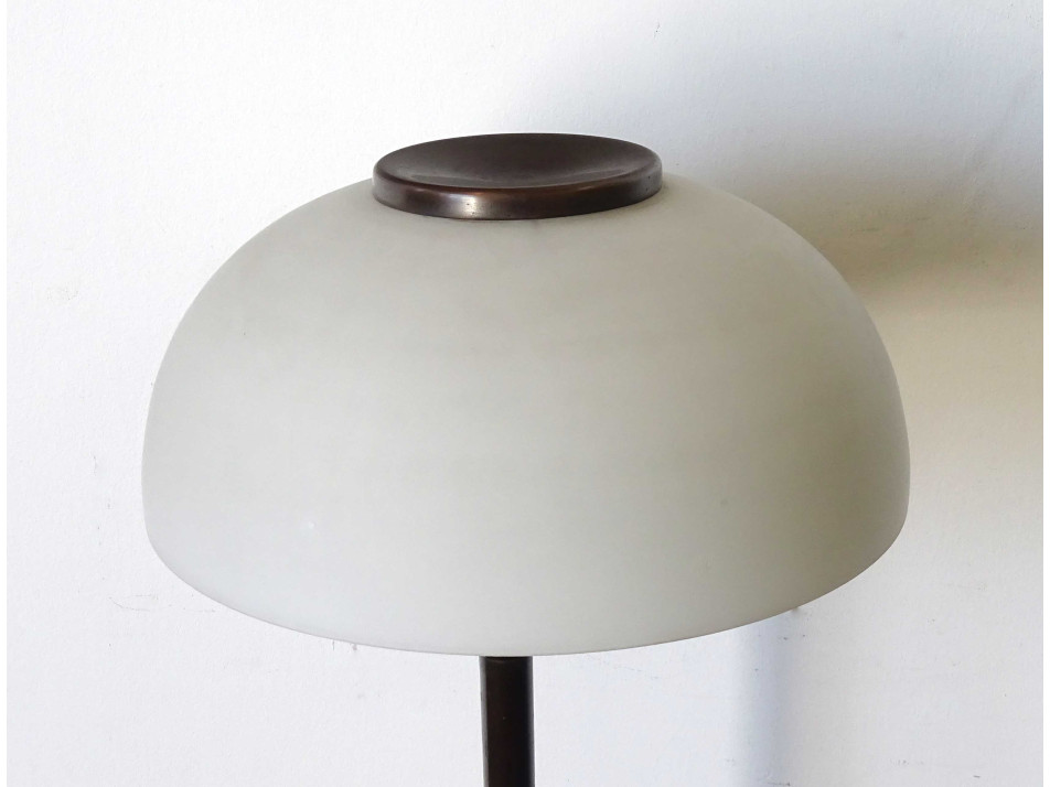 Hibátlan, működő állapotban lévő, formatervezett, bronz színű, fémtestű, space age design állólámpa, olvasólámpa, hangulatvilágítás, hibátlan tejüveg búrával. Nagyméretű (E27) izzó való bele.