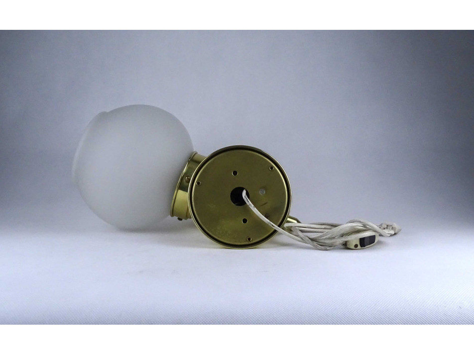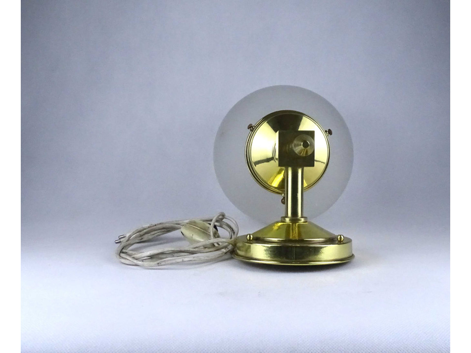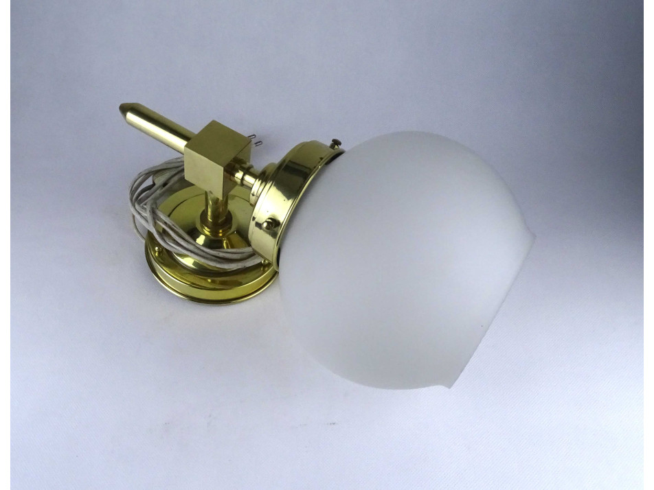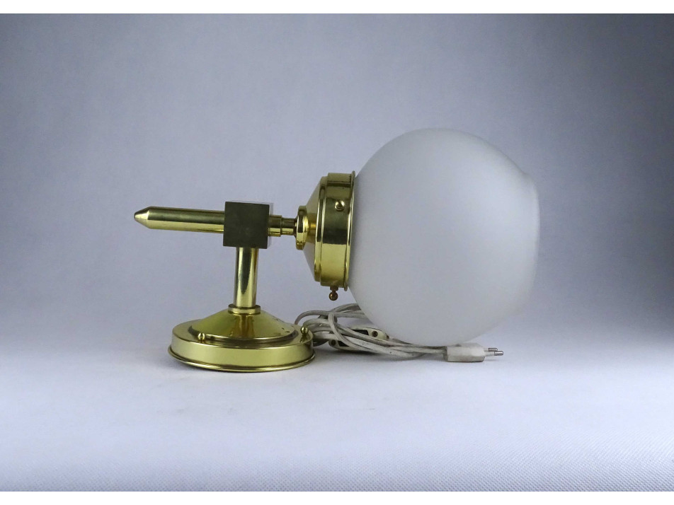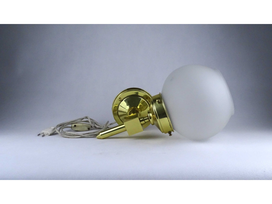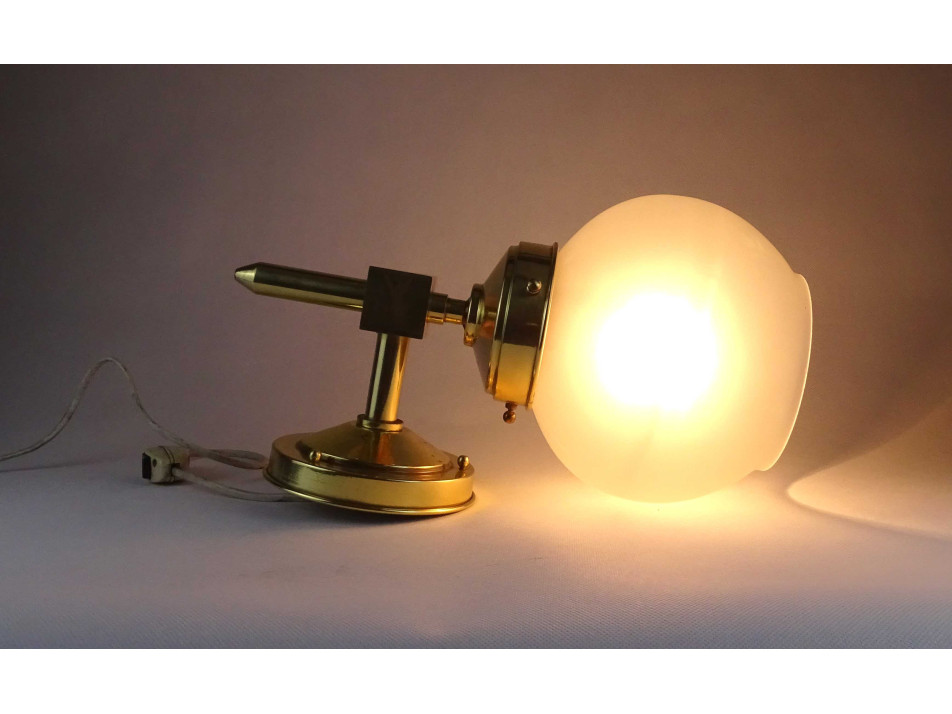 Régi, art deco stílusú, sárgaréz falikar gömb alakú opálüveg búrával. Egyégős nagyméretű, E27-es foglalattal, kéteres vezetékkel, a vezetéken billenő kapcsolóval, működő állapotban. Hátoldalán falra akasztási lehetőség.