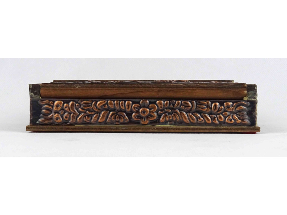 Régi, szép állapotú, plasztikus népi mintákkal és táncoló szerelmespárral díszített, domborított rézlemezekkel borított fadoboz, kártyadoboz vagy cigaretta kínáló doboz.