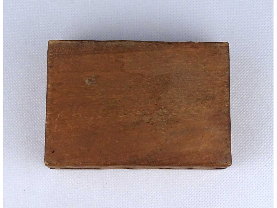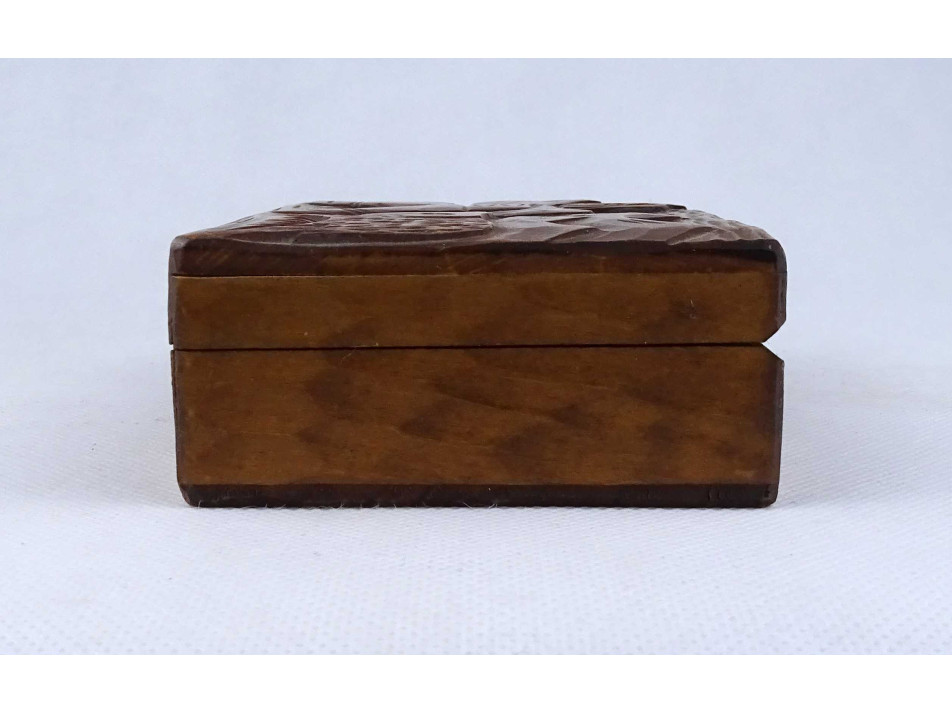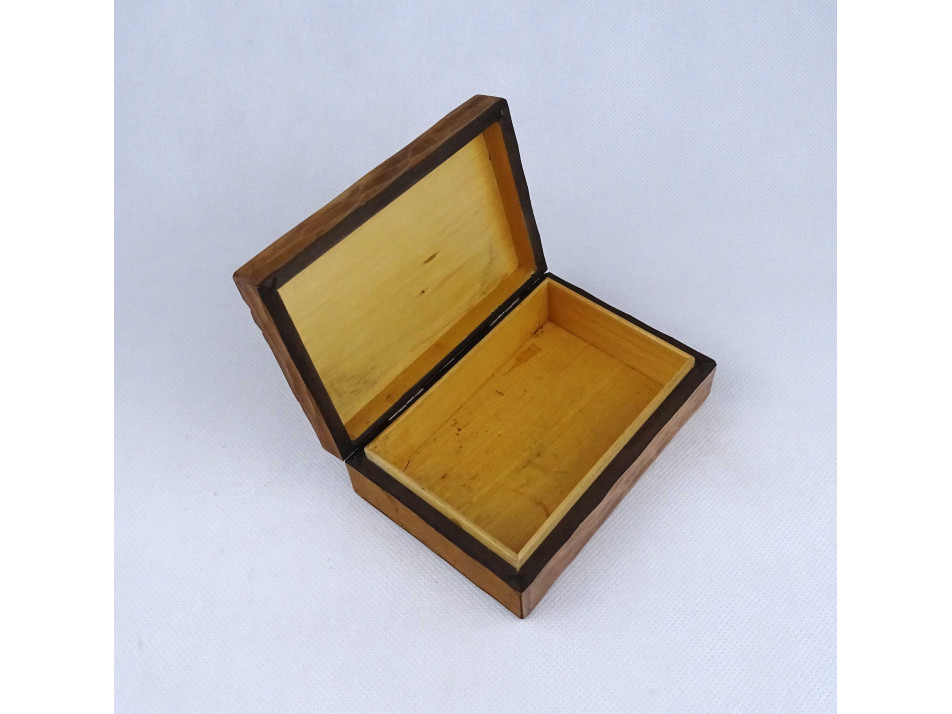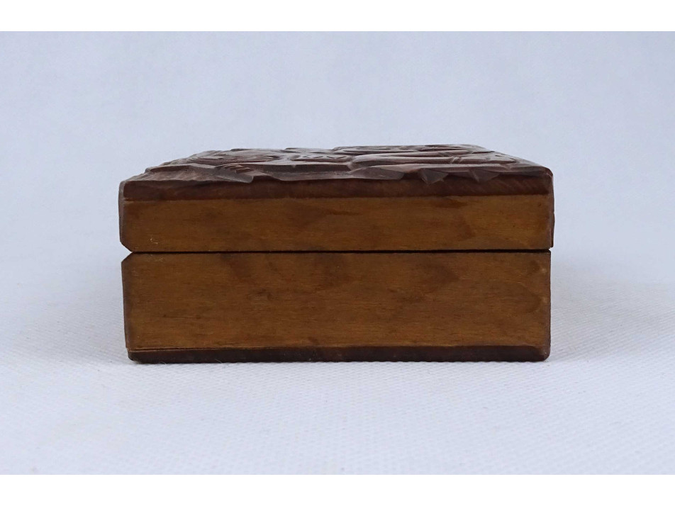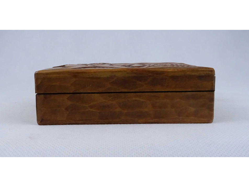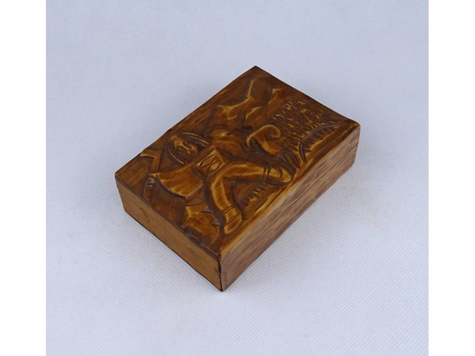 Régi, kisméretű, hibátlan állapotú, faragott pásztorral és kossal díszített fedelű kártyadoboz, fa doboz vagy cigarettás doboz.
