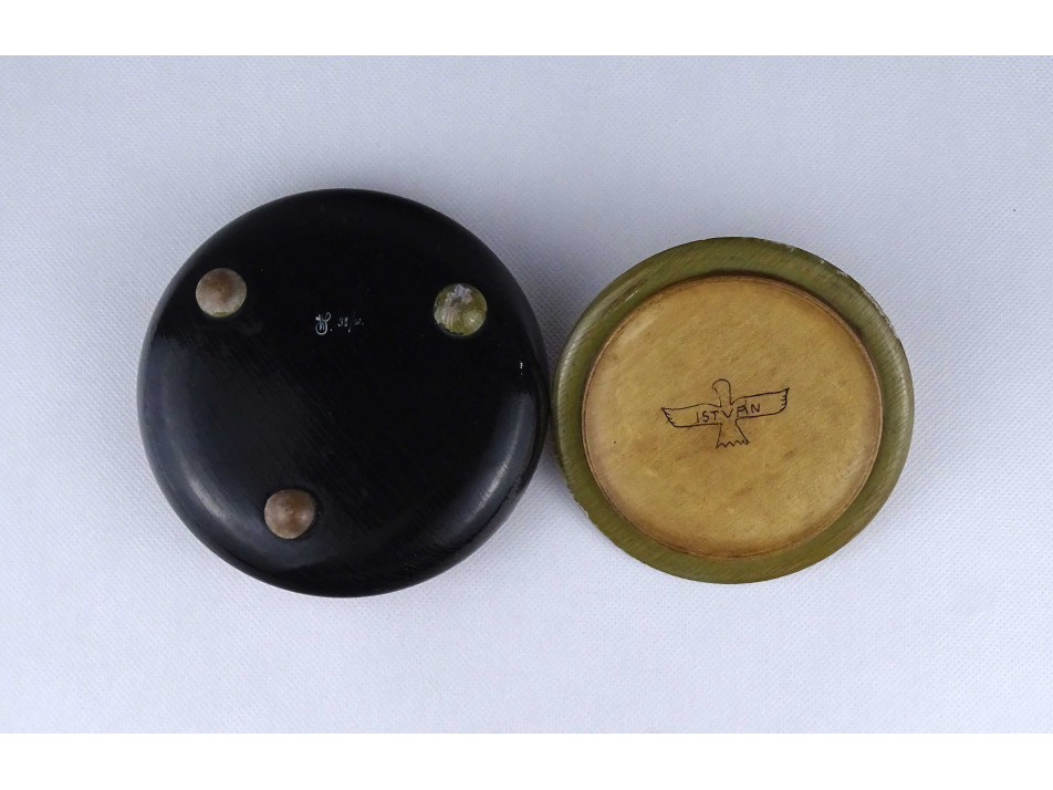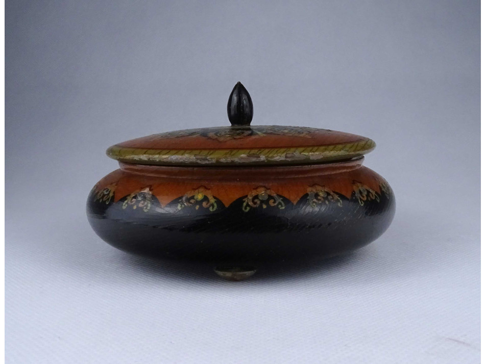 Régi, szép állapotú, nagyméretű, három lábon álló, festett stilizált virágmintával díszített köralakú fa doboz, fa bonbonier. Fedele belső felén festett madáralak benne felirat: ISTVÁN. A doboz felületén a lakk és a festék több helyen sérült, lepattogzott.