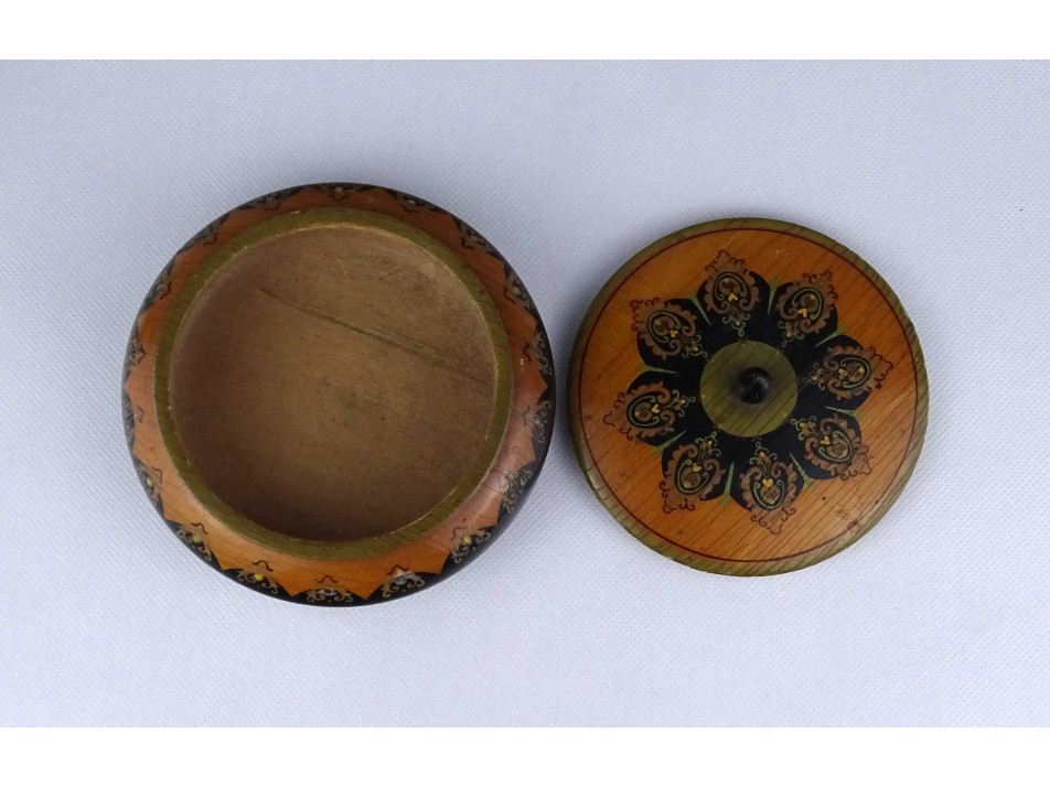Régi köralakú festett virágmintás fadoboz 13.5 cm