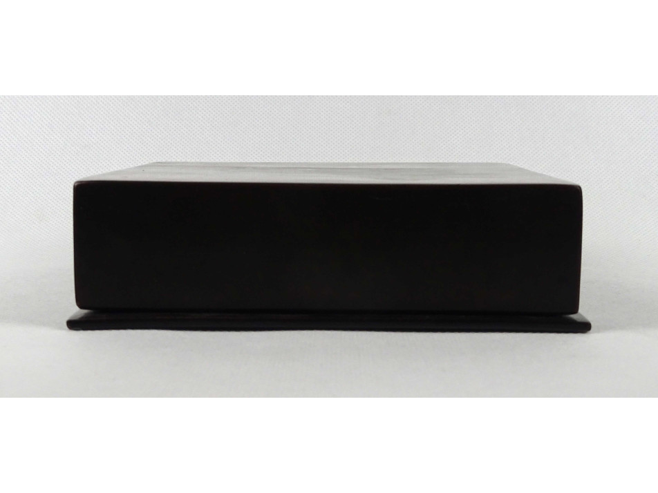 Szép állapotú, kívül fekete, belül piros színű, lakkozott fa ékszertartó doboz. Tetején színes, festett keleti tengerparti látkép díszítés.
