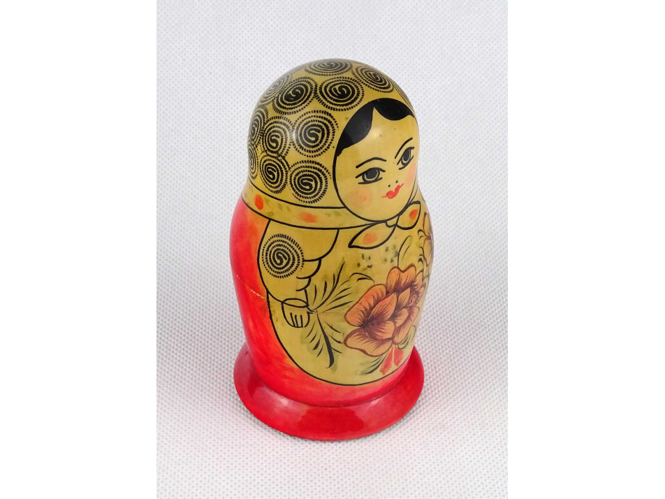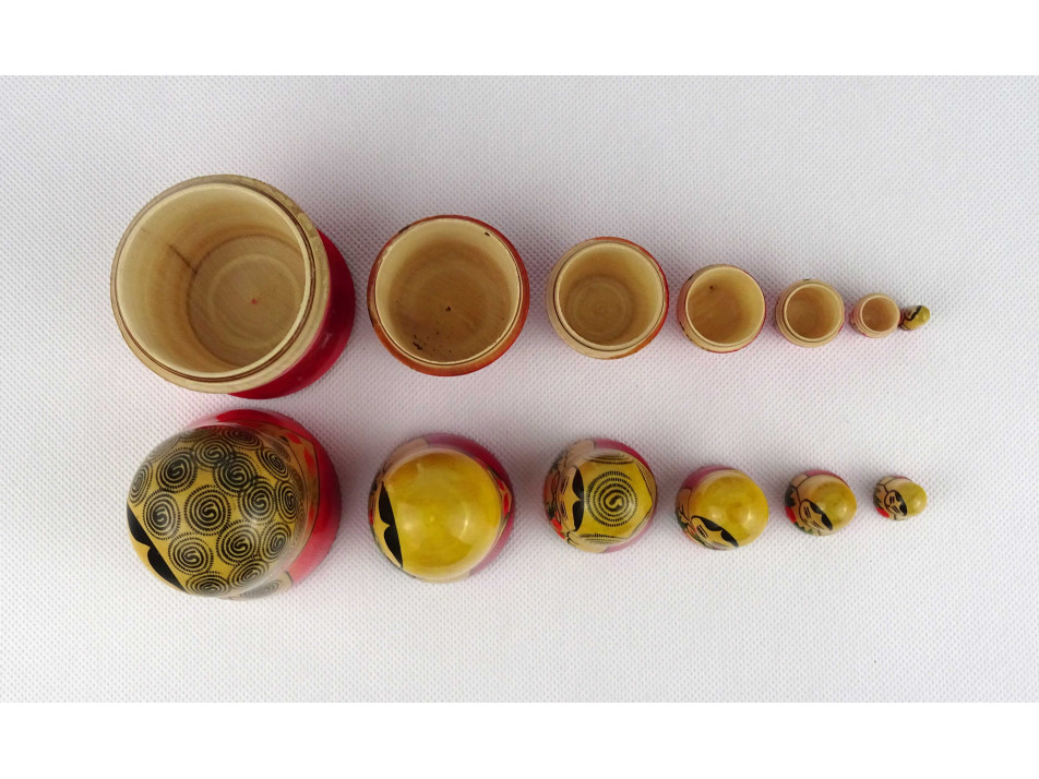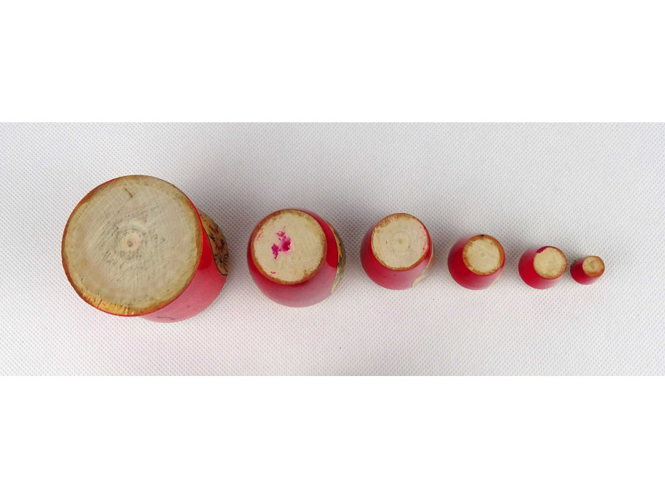 Régi, hibátlan állapotú, szétszedhető, fából készült, kézi festéssel díszített matrjoska baba készlet.