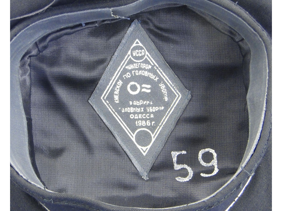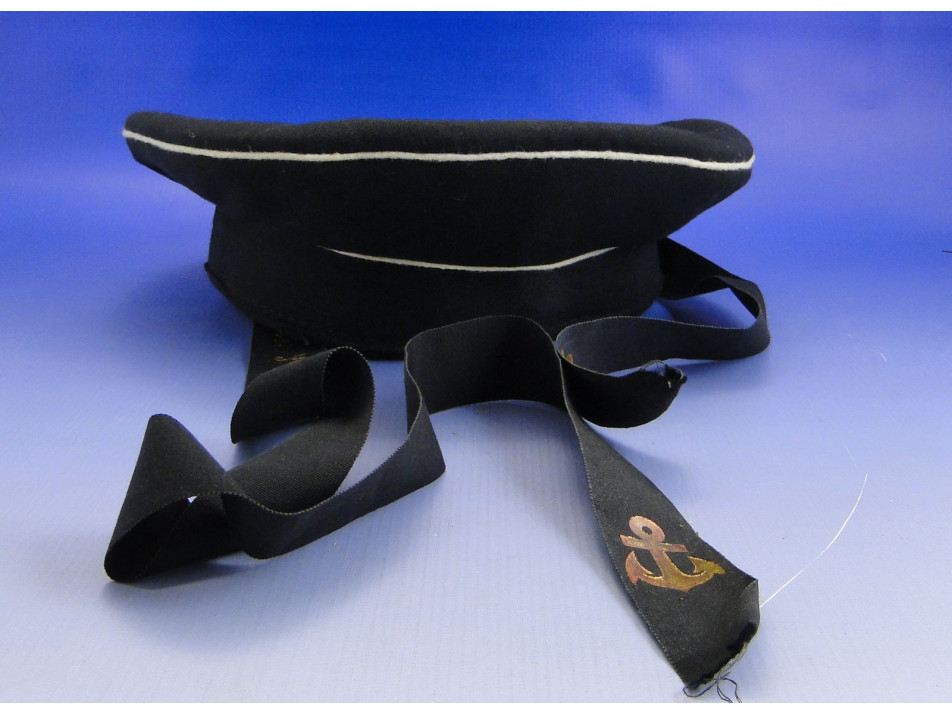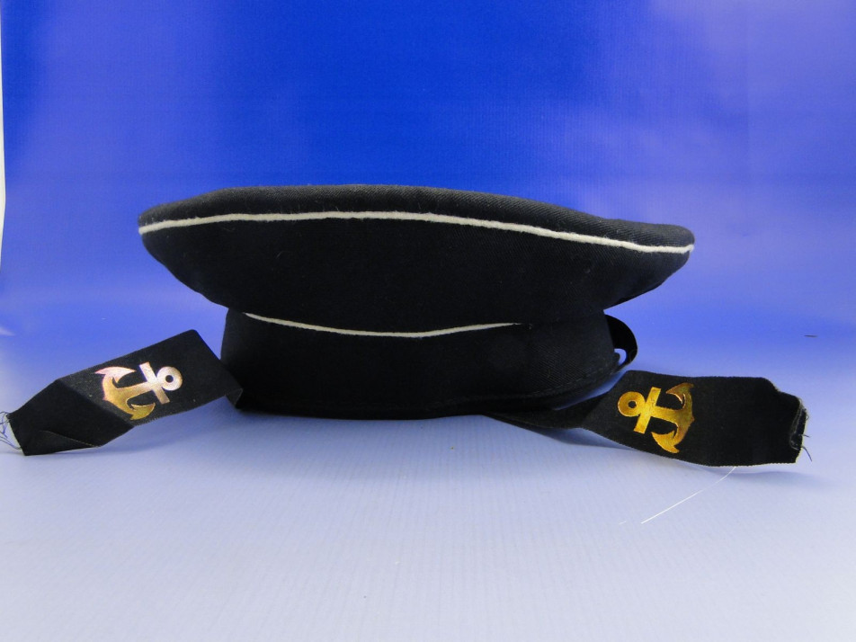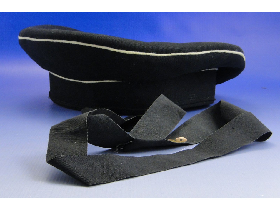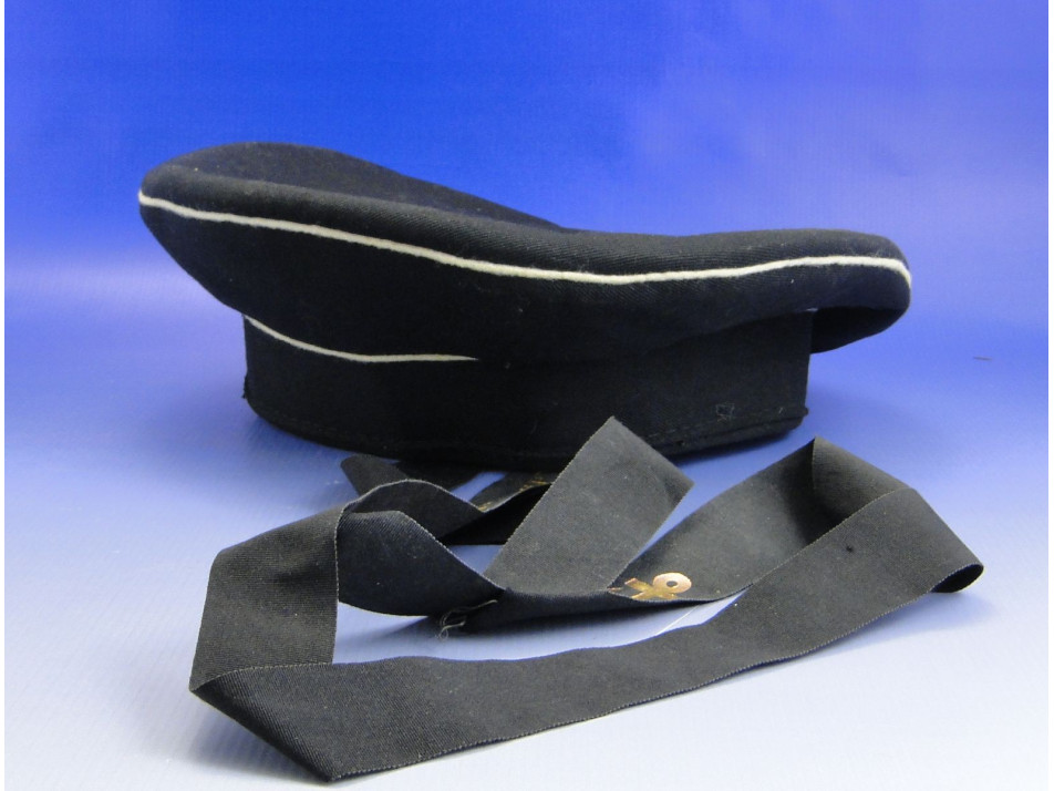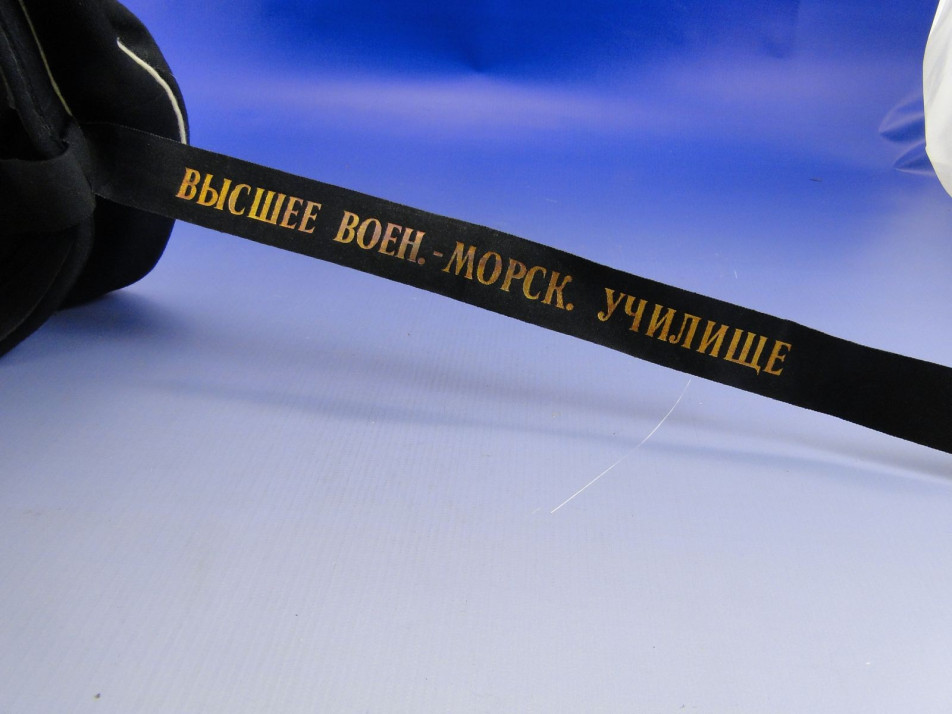 Szép állapotú fekete színű hosszú szalag díszes orosz katonai, tengerészeti sapka, fejfedő.