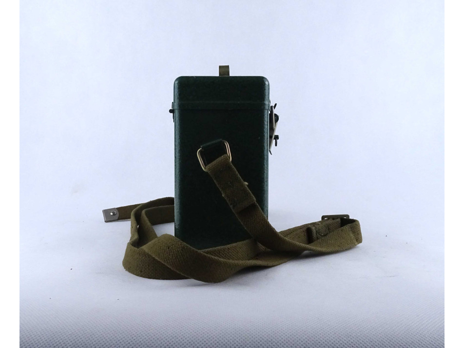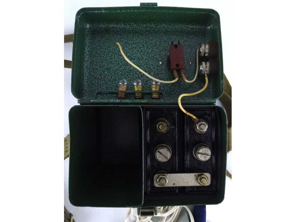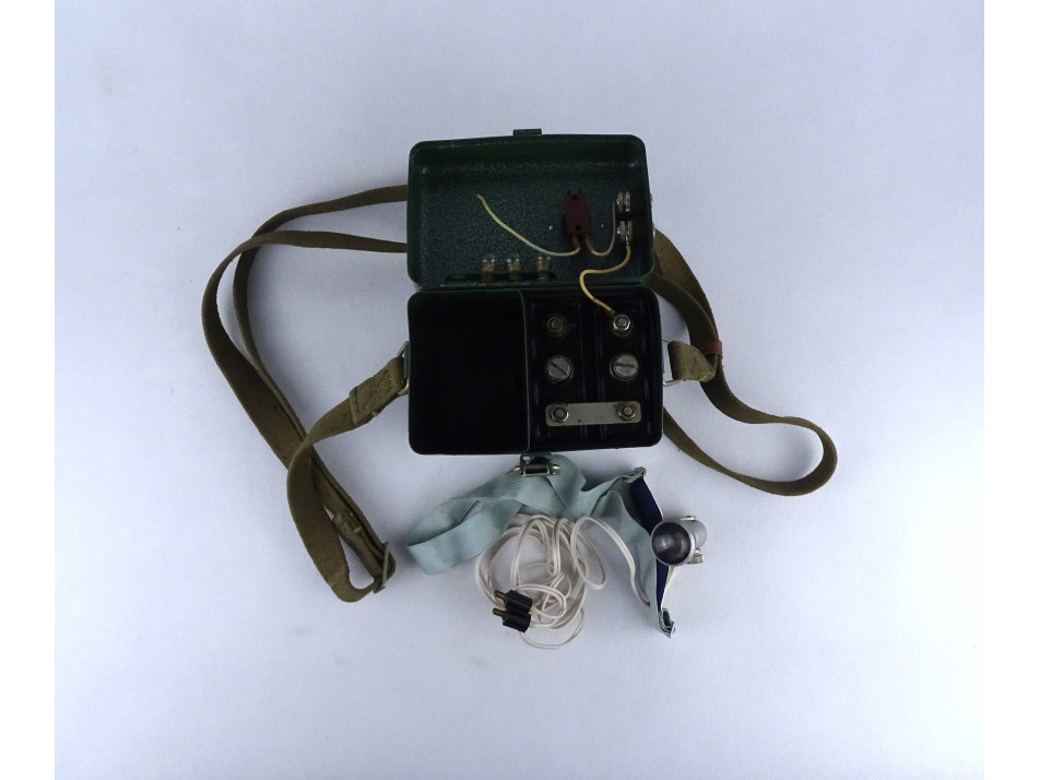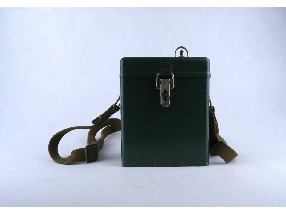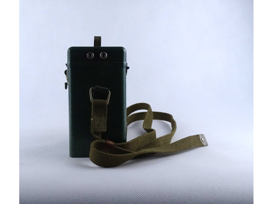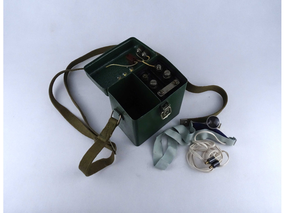 Régi szovjet katonai, haditechnikai eszköz. Fém hordtáskában található, akkumulátoros fejlámpa. A hordtáska vászon vállpánttal rendelkezik. A szerkezet nem működik, a vezetékek nem kapcsolódnak az akkumulátorokhoz.