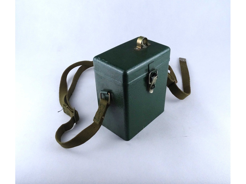 Régi szovjet katonai haditechnikai eszköz - akkumulátoros fejlámpa fém hordtáskában
