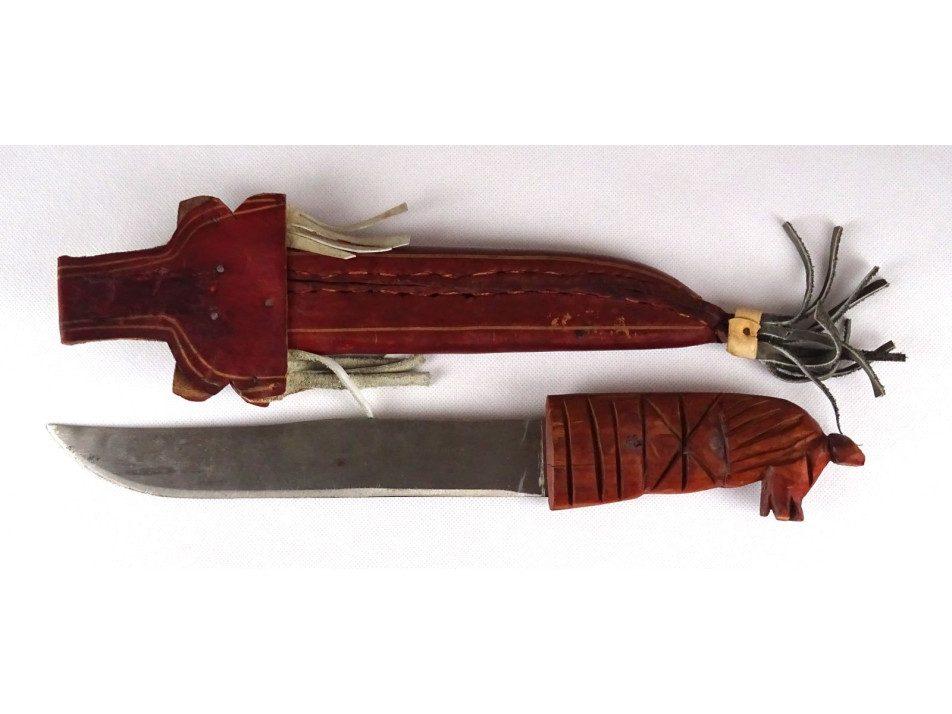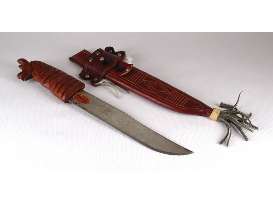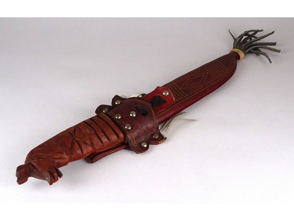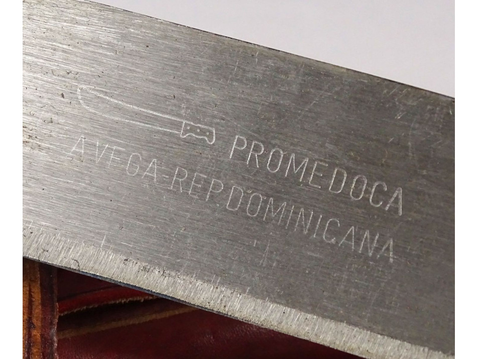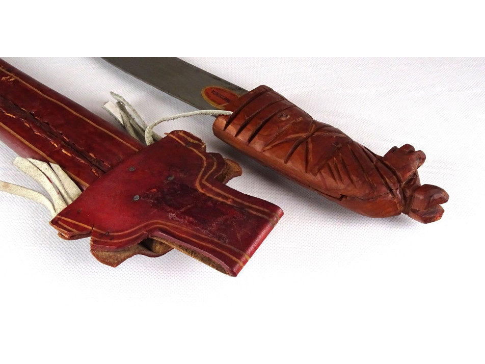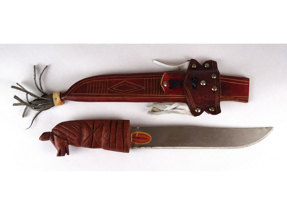 Díszes bőr tokjában található, jelzett dominikai acélpengés macséta, bozótvágó kés. Díszes, övre fűzhető börtokban, faragott lófejes markolattal. Nem használati tárgy. Dísztárgy!
