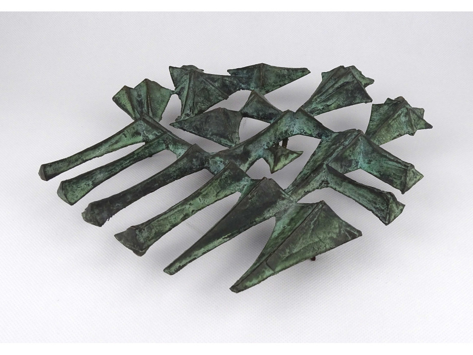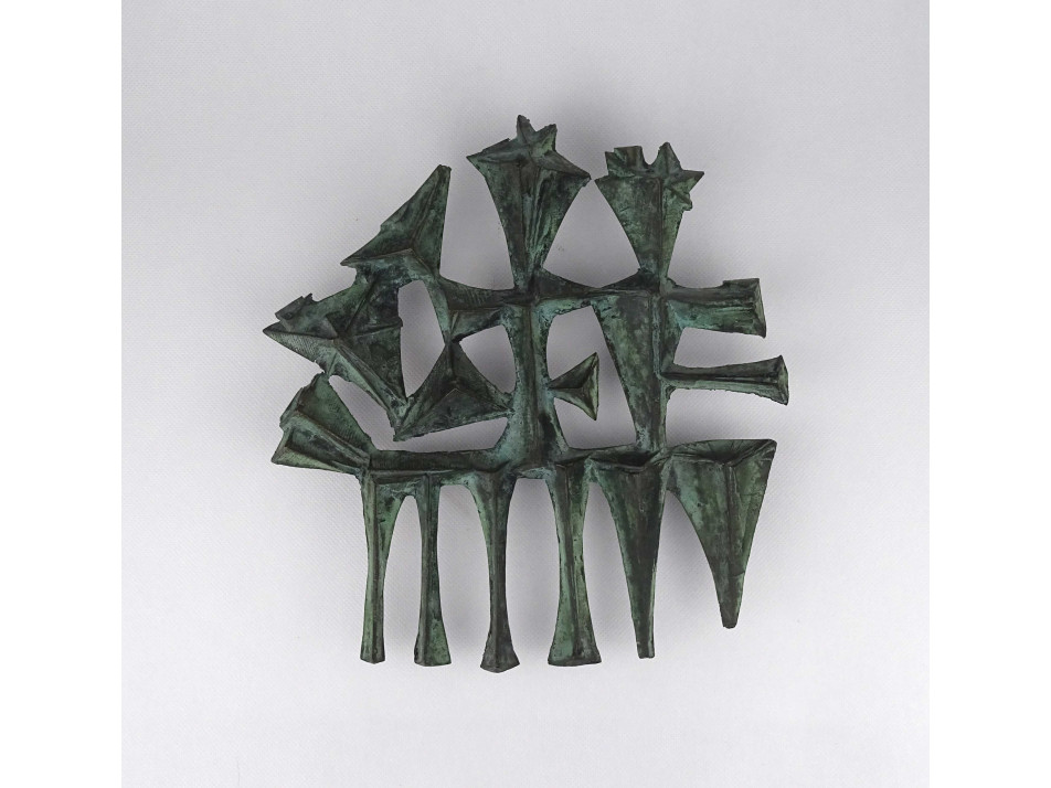 Régi, jelzetlen iparművészeti munka, patináns bronz falidísz, stilizált emberalakokat ábrázoló dombormű.
