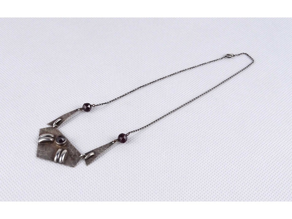 Régi, ezüstözött alpakka nyaklánc, nyakék, kalapált háromszög alakú középrésszel, piros üveg kövekkel díszítve.