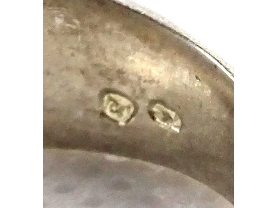 Régi, jelzett, 925-ös finomságú ezüst férfi pecsét gyűrű, 25-ös számjegyet formáló gyűrűfejjel. Benne beütött repülő daru bal oldalán 1-es jelzéssel, ami az 1966-tól használt 925-ös finomságjelzés, mellette "MCS" mesterjel.
