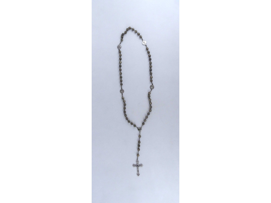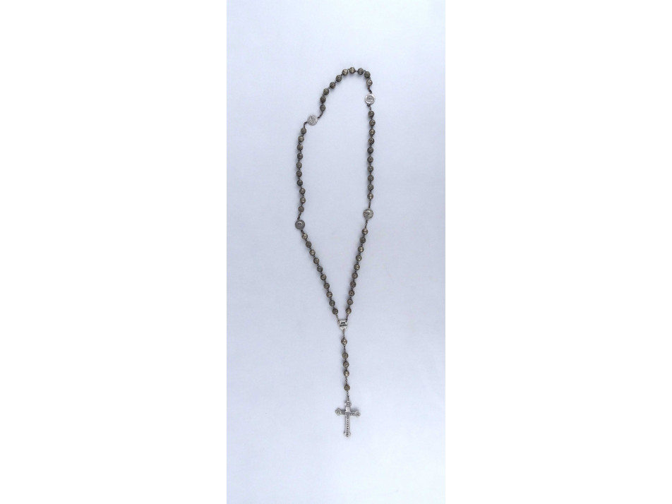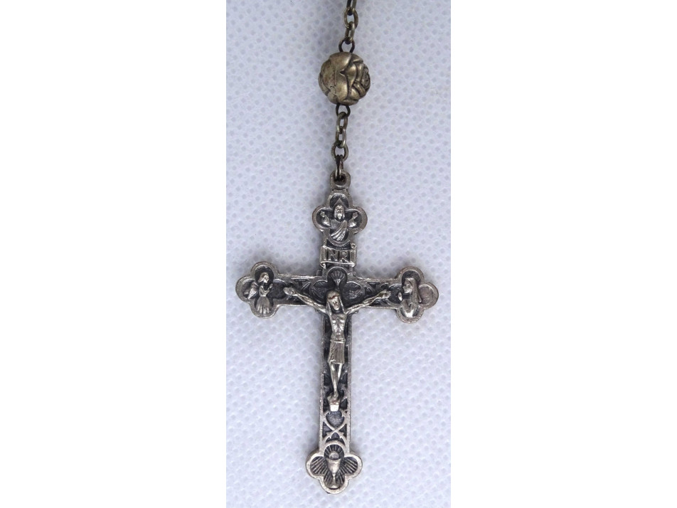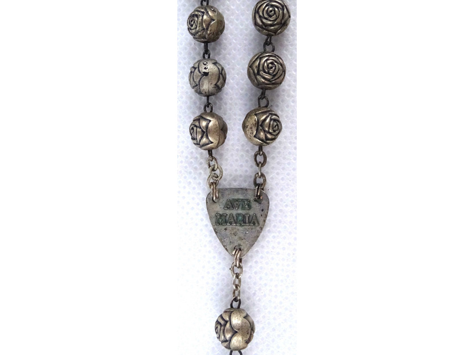 Régi, nagyméretű, díszes kereszttel rendelkező, rózsabimbót formáló gyöngyökből álló, ezüstözött, fém olvasó rózsafüzér.