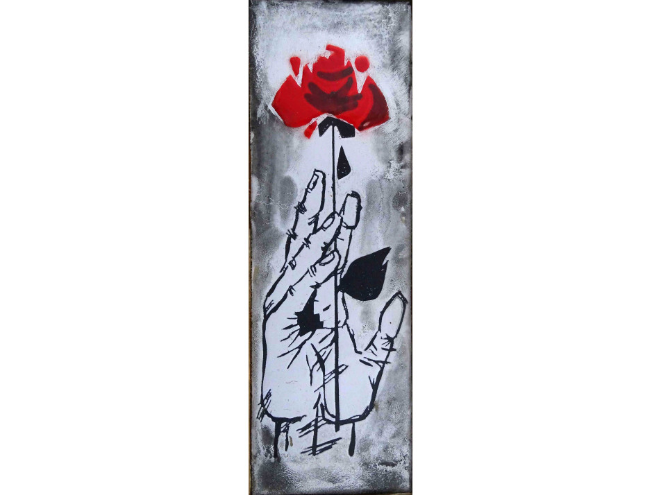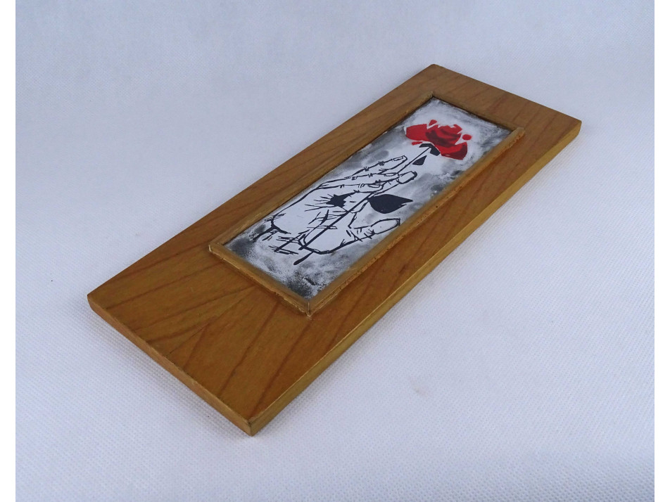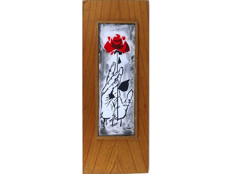 Régi, jelzetlen, rózsát tartó kezet ábrázoló, fa táblára illesztett, tűzzománc falikép, falidísz.