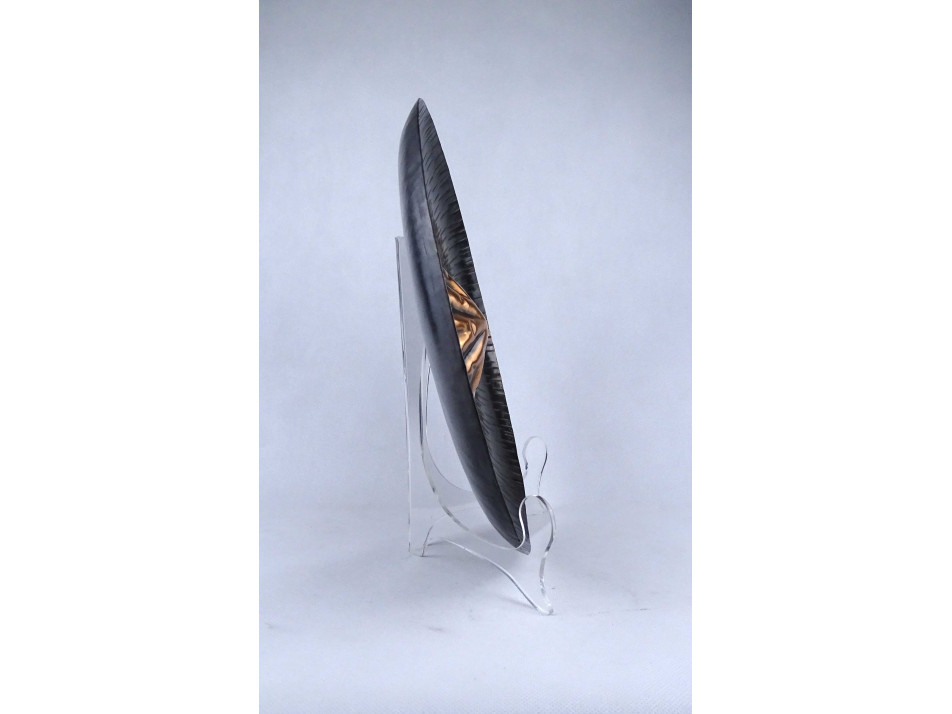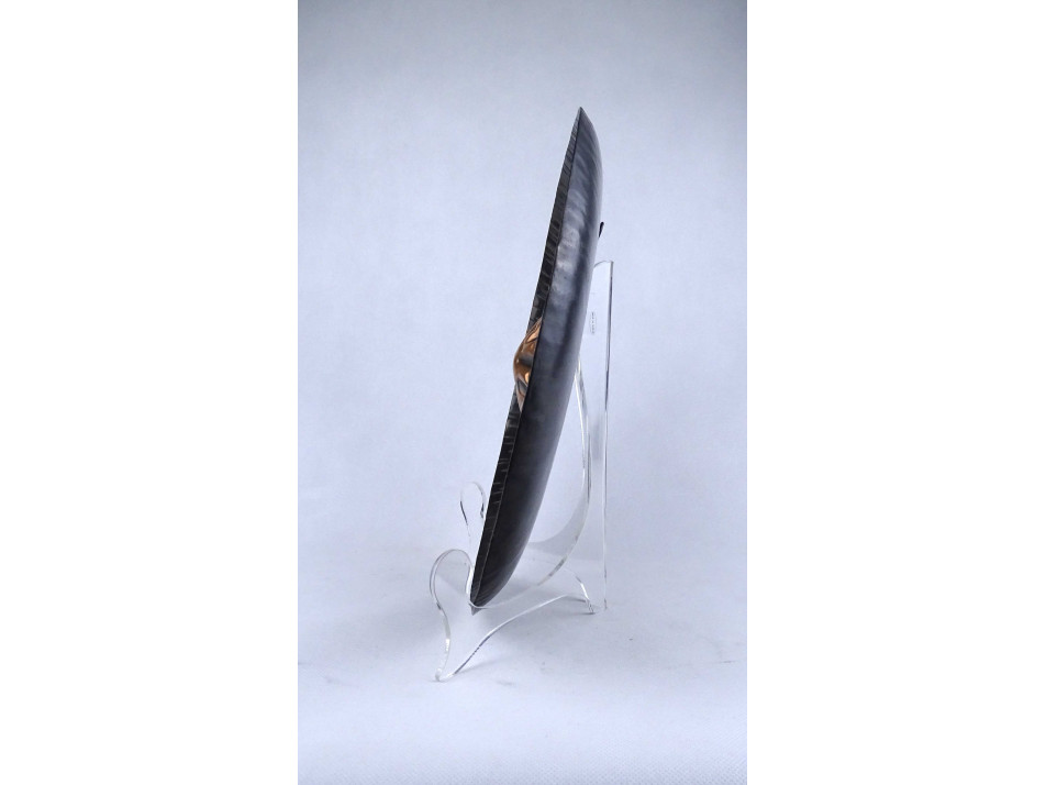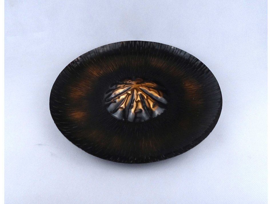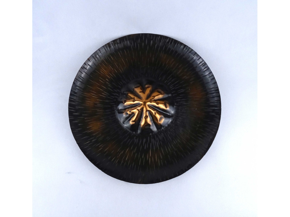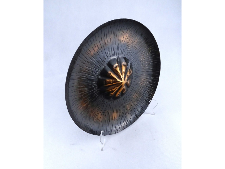 Szép állapotú, nagyméretű, jelzetlen iparművészeti vörösréz falidísz tál, közepén dudorszerűen kidomborodó kalapált díszítéssel. Falra akasztási lehetőséggel.