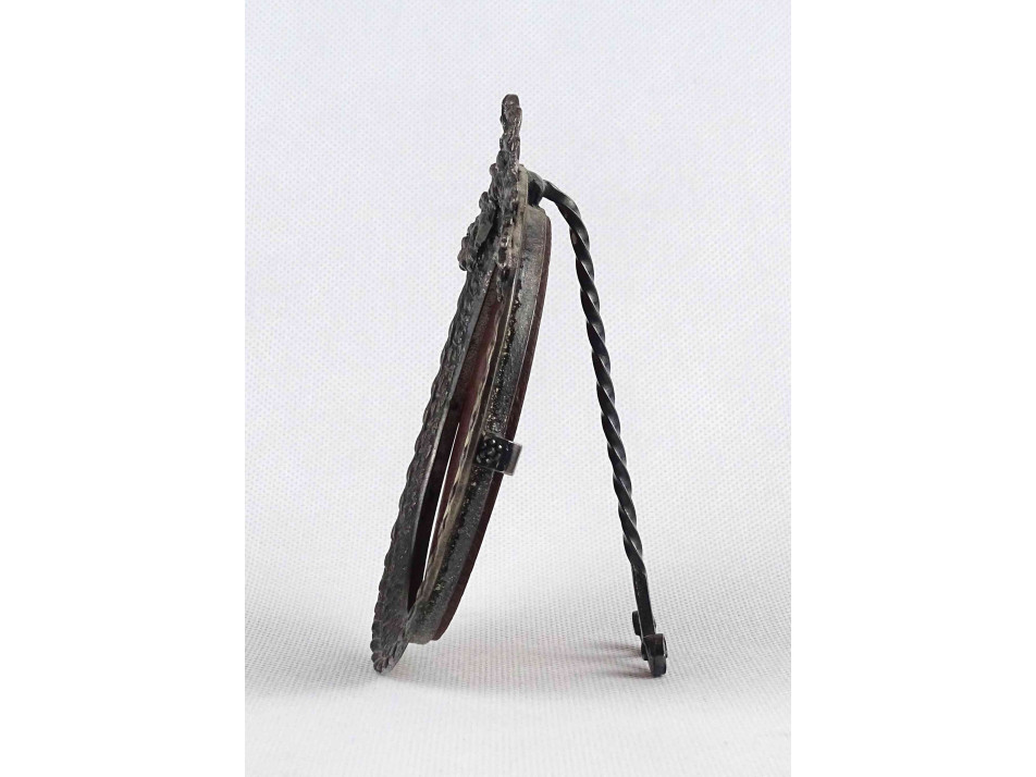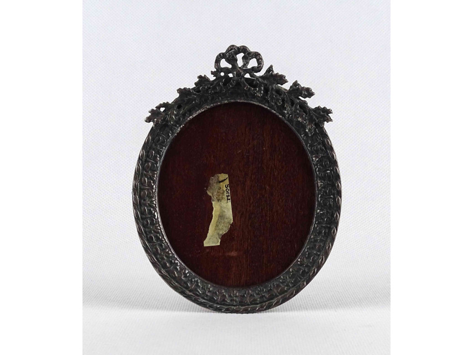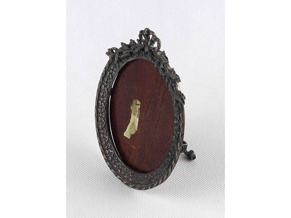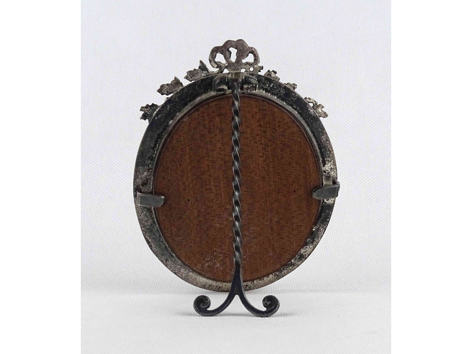Hibátlan állapotú, dekoratív, ezüst színű masnis, ovális fém képkeret, fényképtartó keret. Fa hátlapja megvan, üveglapja nincs, hátulja támasztékkal rendelkezik.