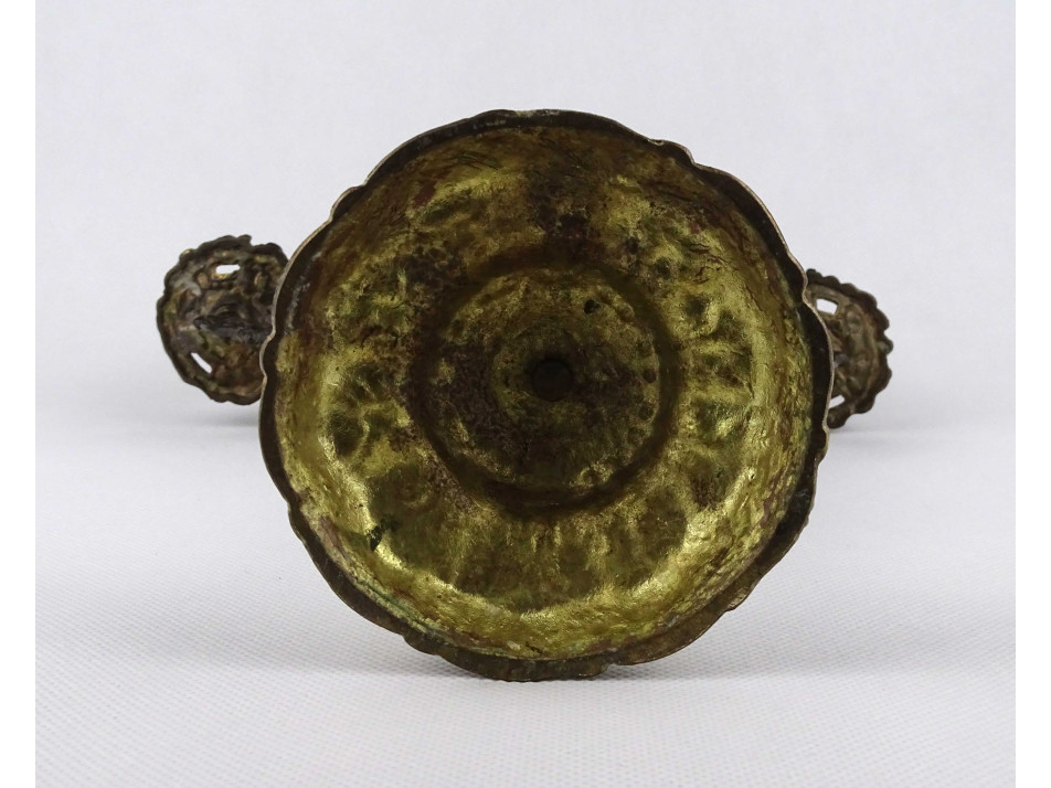 Régi, szép állapotú, nagyméretű, díszes, három állásos, réz gyertyatartó. Teste egy puttót vagy angyalt formáz, amely a gyertyákat tartja. A gyertyatartó menetes, darabokra szedhető.