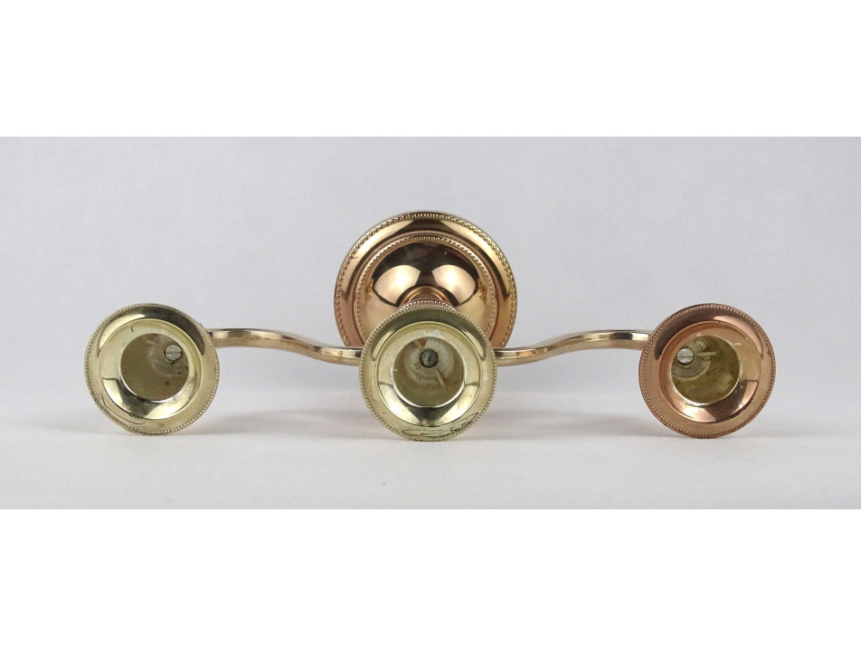 Régi, hibátlan állapotú, három ágú, vastagon ezüstözött, fém karos gyertyatartó. Ezüstözése hibátlan, kopásmentes.
