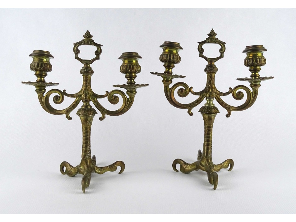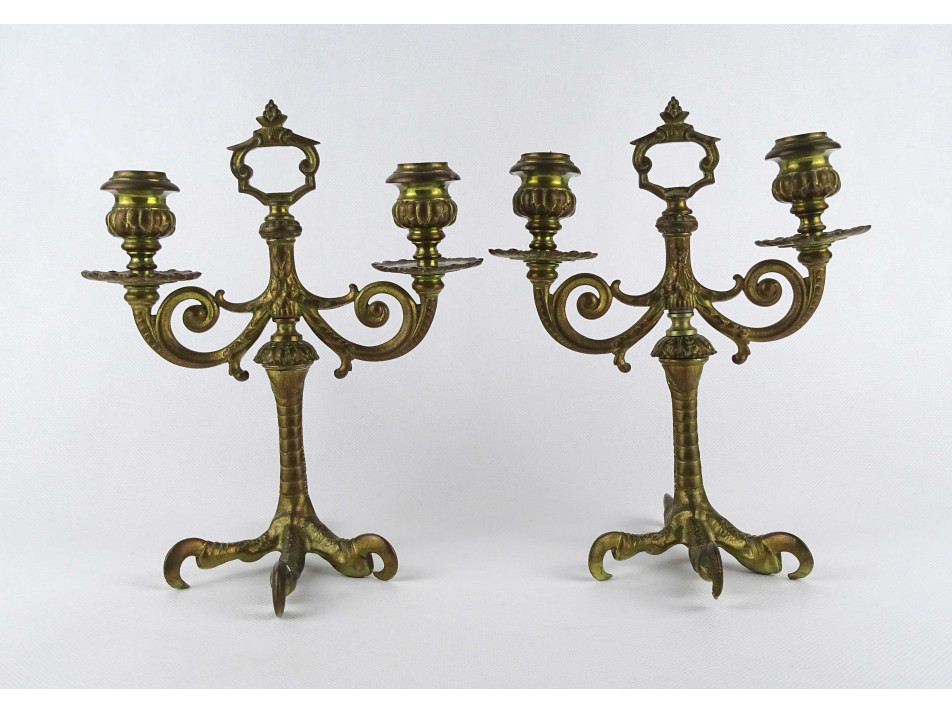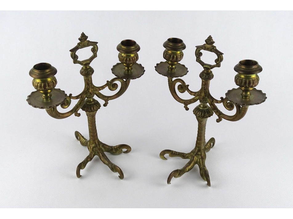 Régi, szép állapotú, részletes kidolgozású, plasztikus saslábat formázó, talapzaton álló, kétkaros réz gyertyatartó pár.