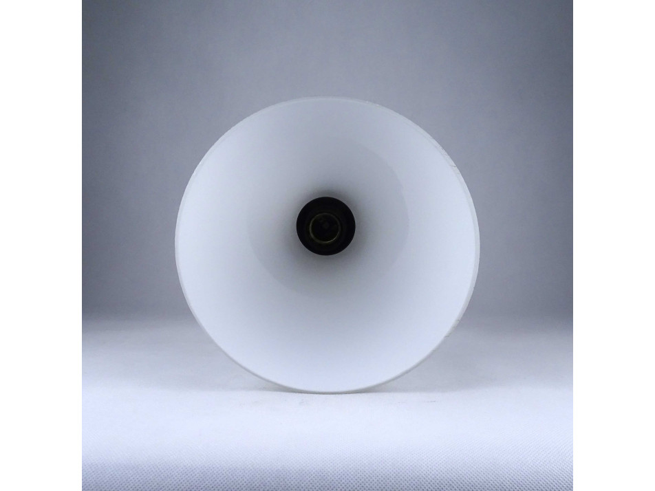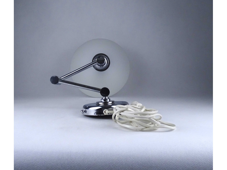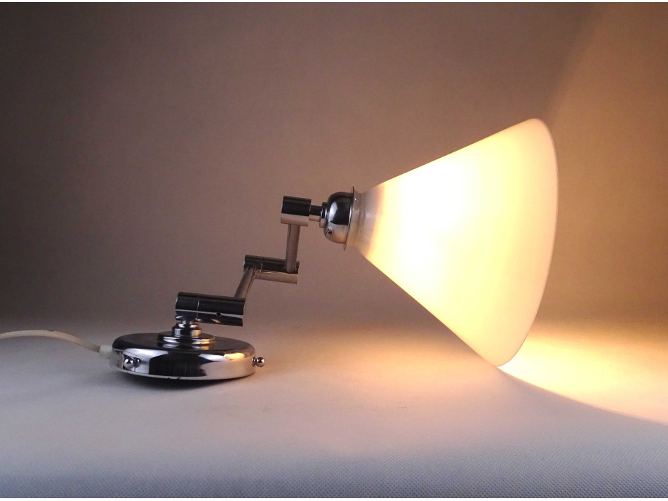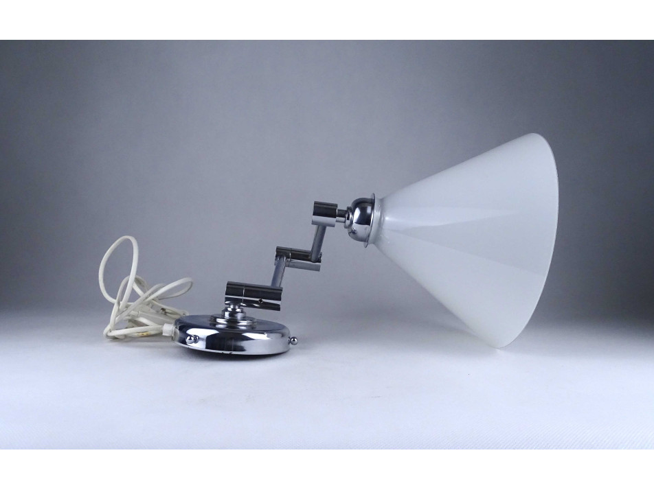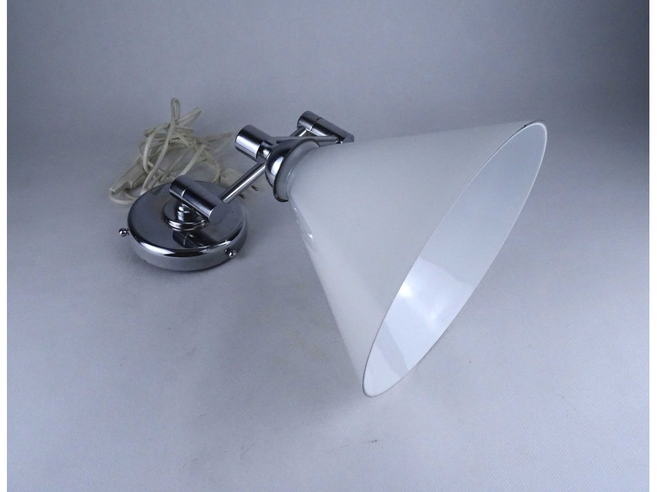 Régi, modern stílusú, krómozott fém falikar fehér tejüveg búrával és két részből álló, mozgatható karral. Műanyag, nagyméretű E27-es foglalattal, korszerű földeletlen dugvillával, a vezetéken elhelyezett billenőkapcsolóval, működő állapotban. Hátoldalán falra akasztási lehetőség.