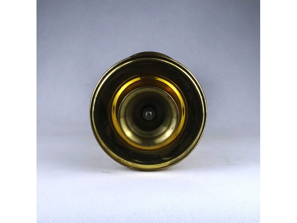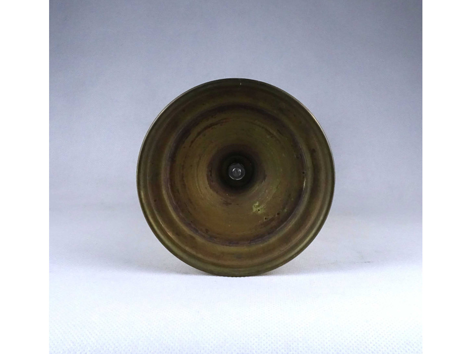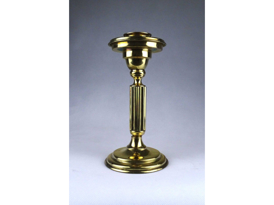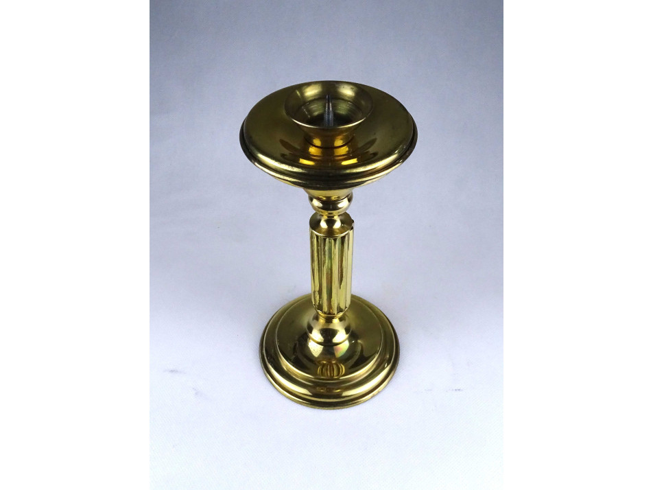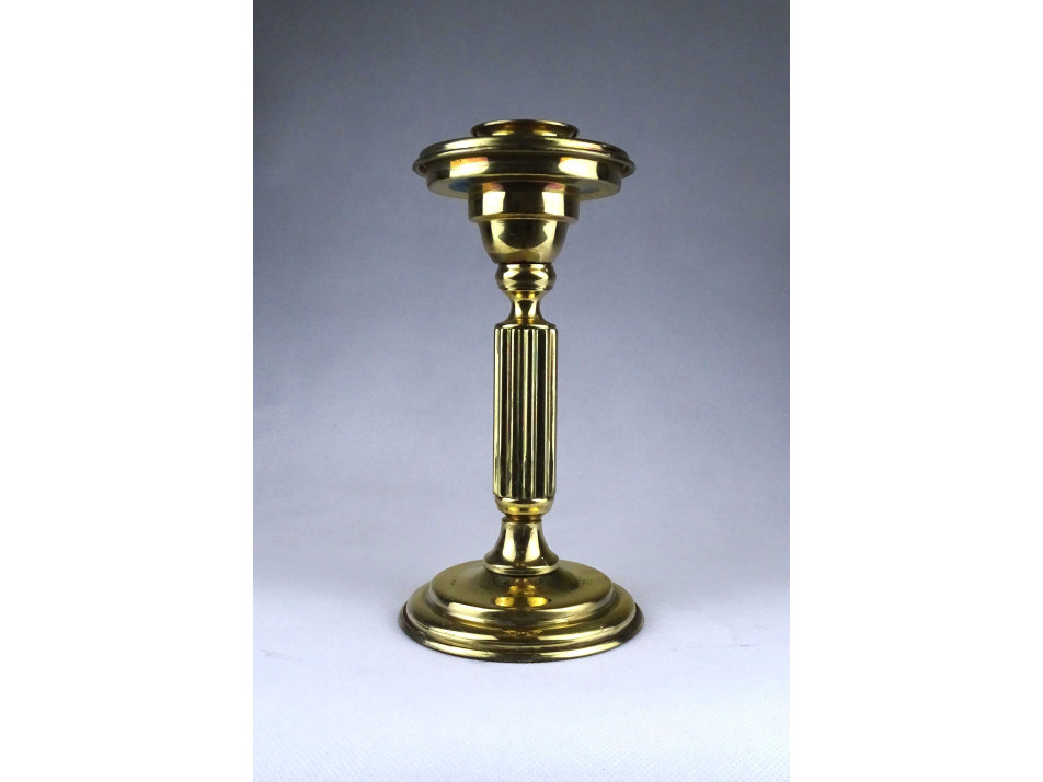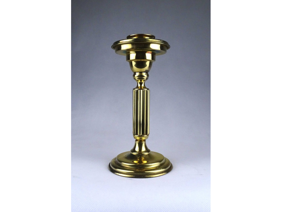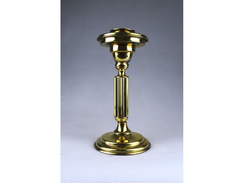 Modern formavilágú, jelzetlen, iparművészeti sárgaréz, bordázott oszlopszerű gyertyatartó, mécsestartó.