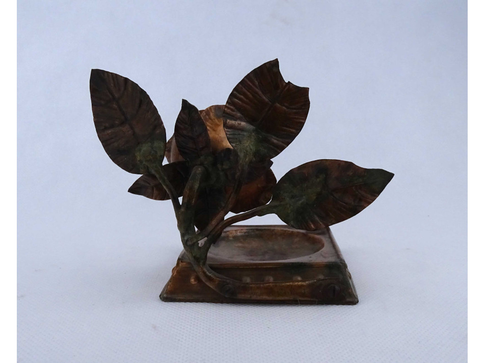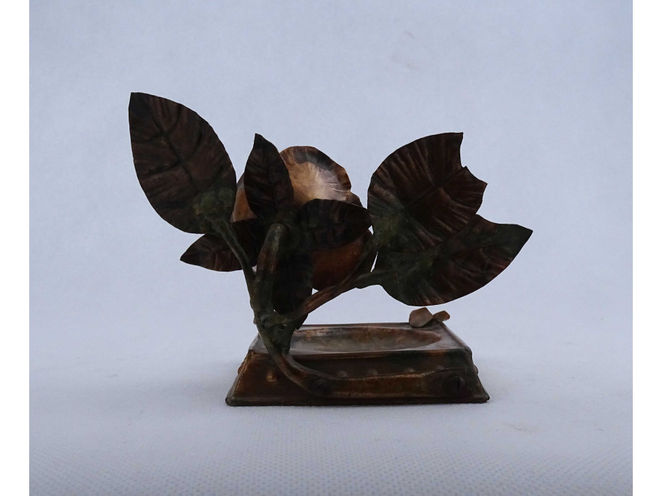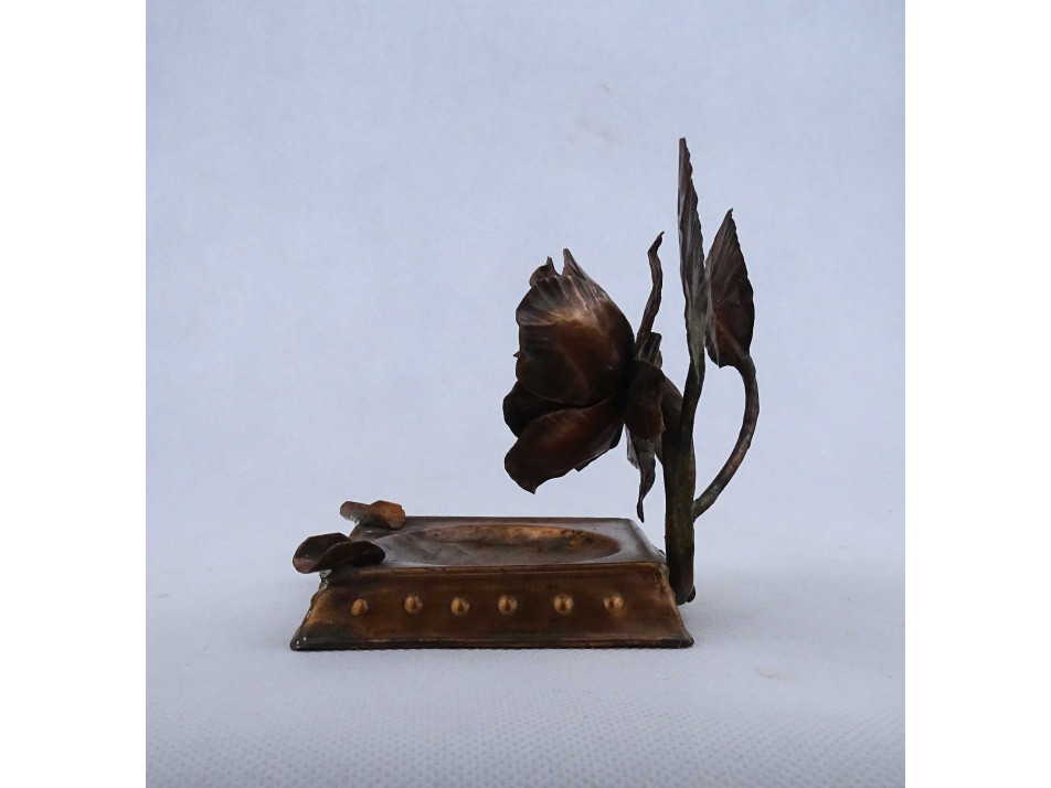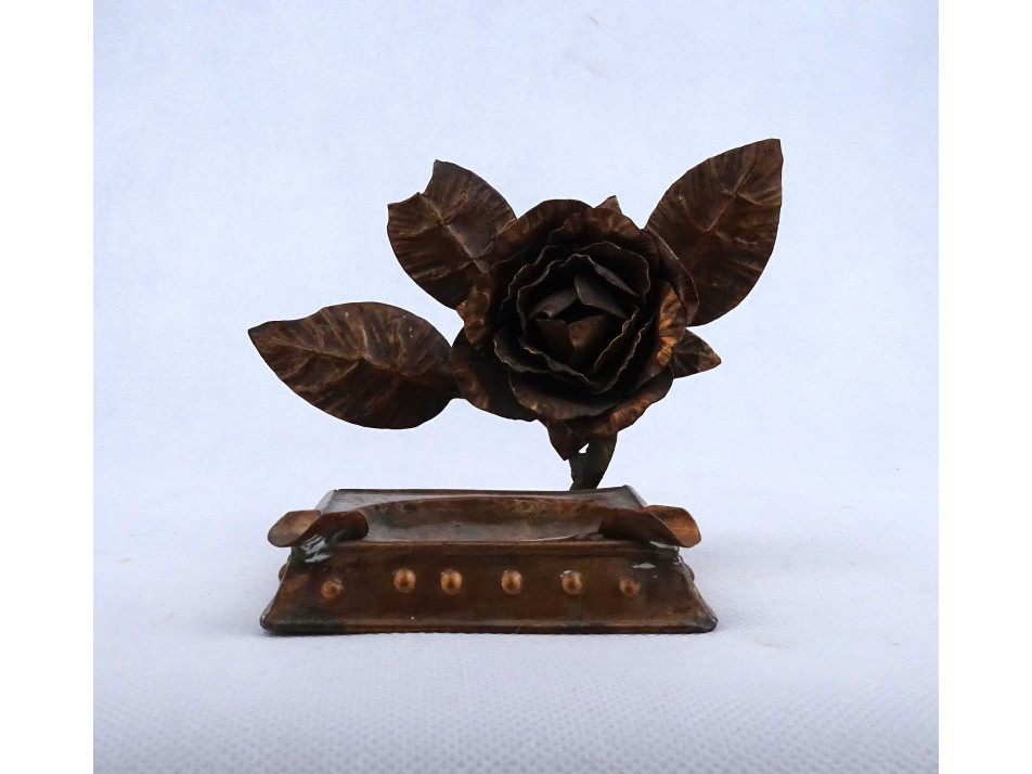 Kézimunkával készült, kalapált, domborított mintákkal és egy nagymértű plasztikus rózsával díszített kétállásos, réz hamutál. A rózsa egyik levele mozog.