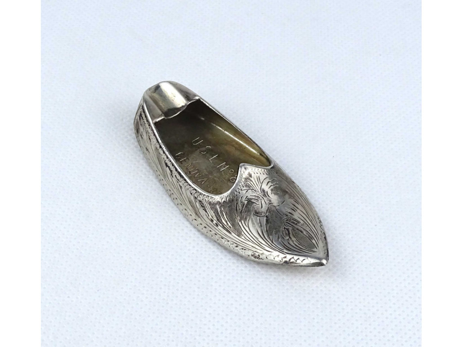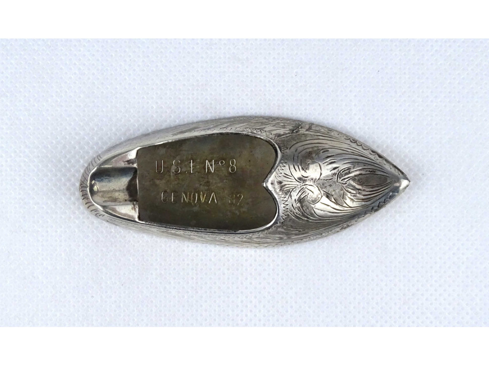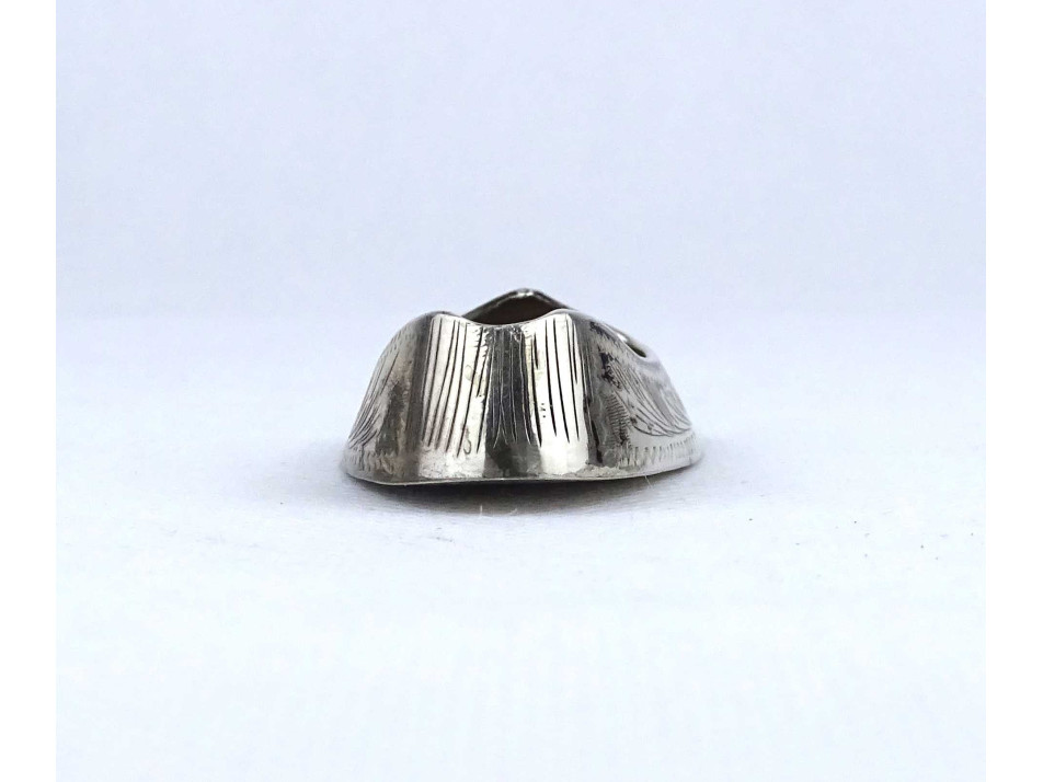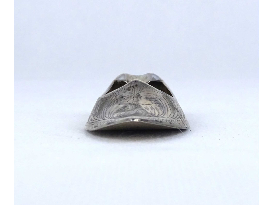 Régi, hibátlan állapotú, kisméretű, vésetekkel díszített ezüstözött, keleti cipő alakú fém hamutál.