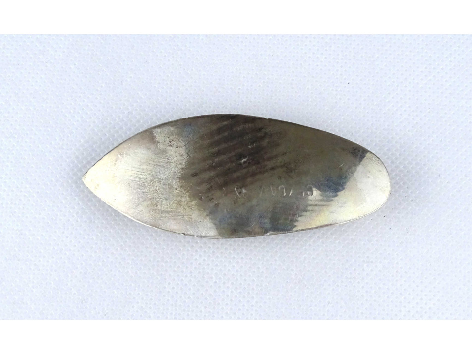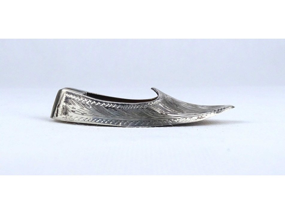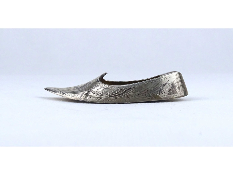 Díszes keleti vésetekkel díszített Aladin cipő alakú ezüstözött fém hamutál 8.7 x 3.5 cm