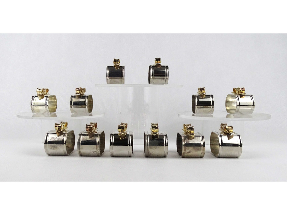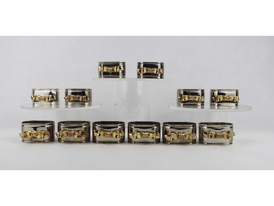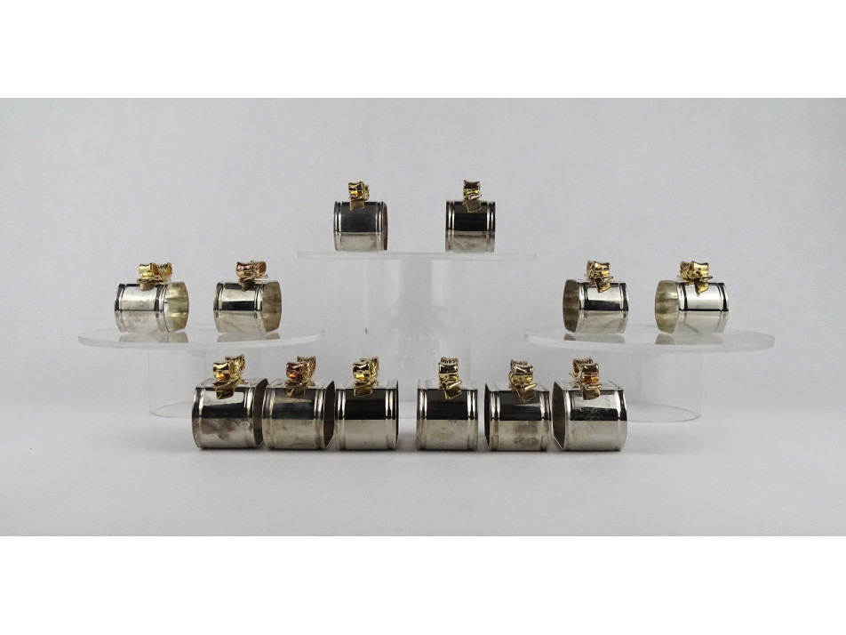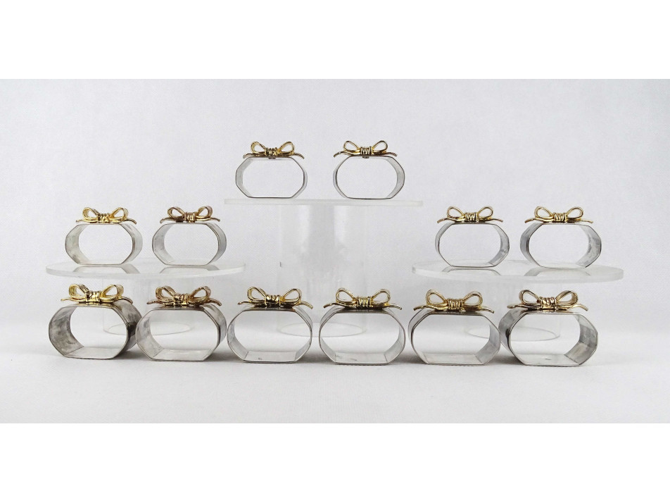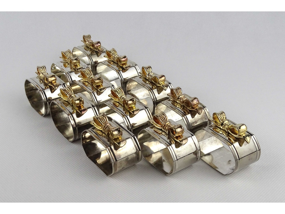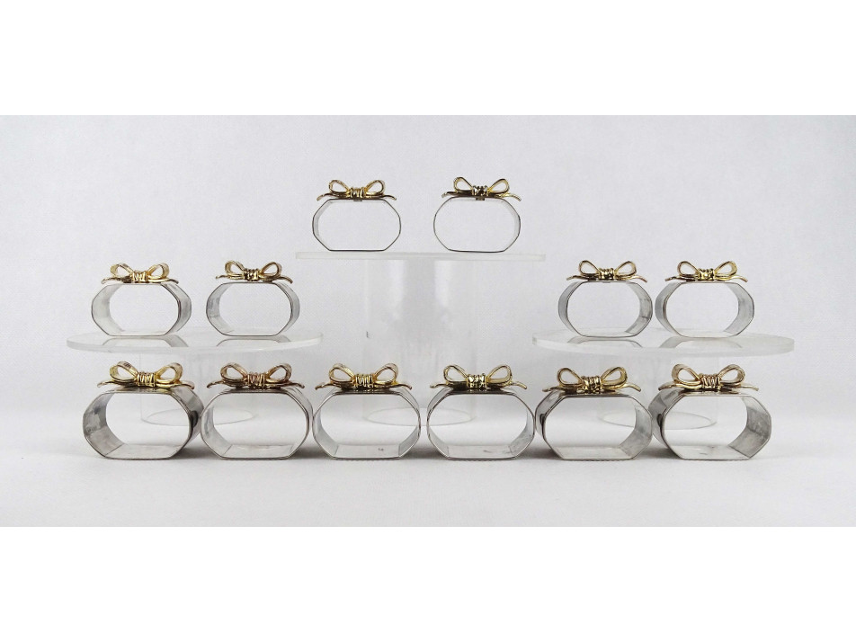 Gyönyörű állapotú, aranyszínű masnival díszített, ezüstözött, fém szalvéta tartó, szalvéta gyűrű készlet. 12 darab egyben.