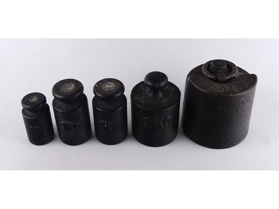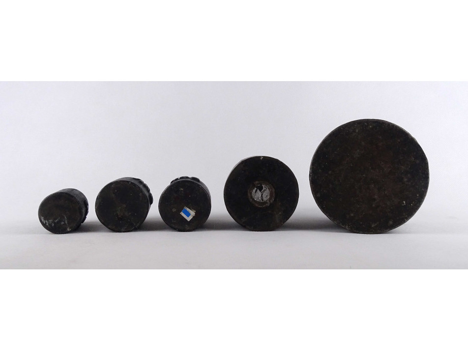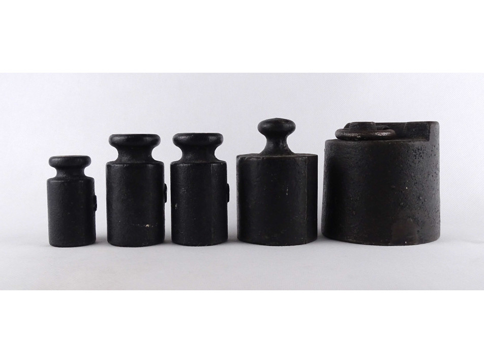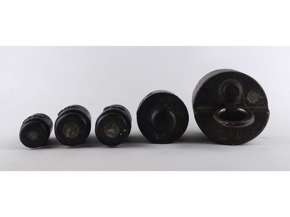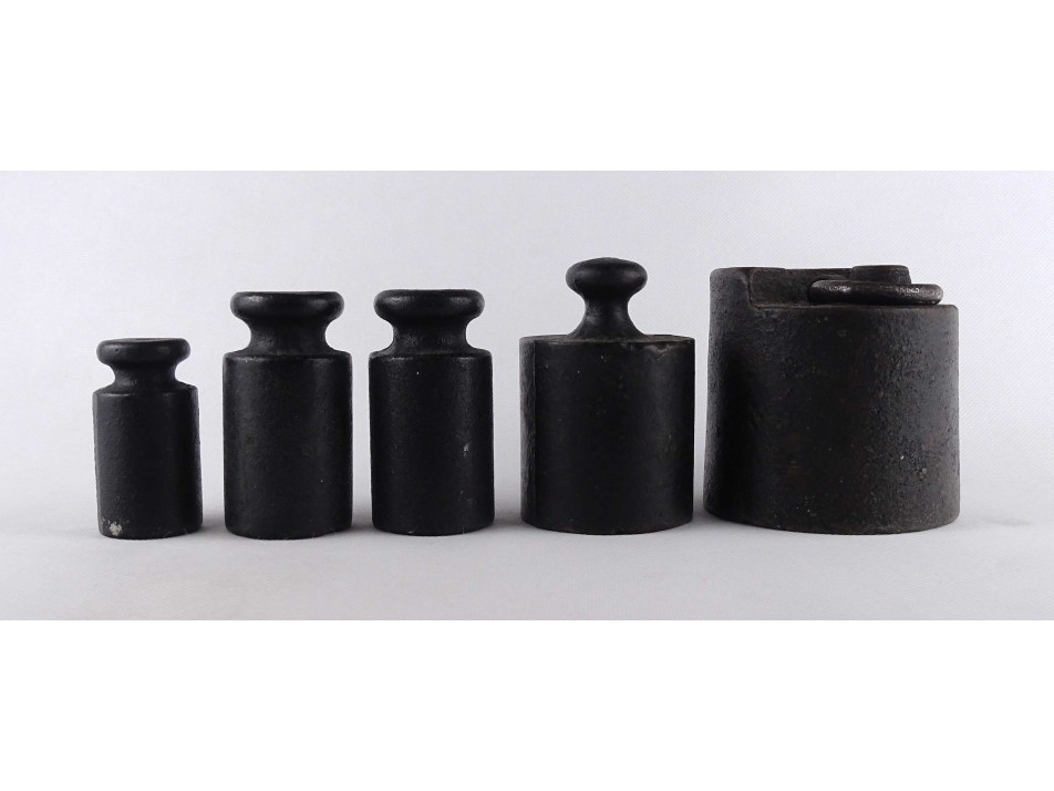 Nagyon régi öntöttvas súlyok, összesen 5 darab, 9.5 kg. Mindegyik súlyon ólomba ütött hitelesítő bélyegek találhatóak.