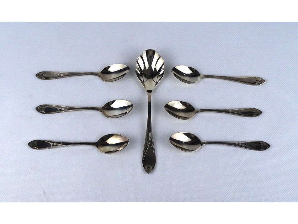 Régi vastagon ezüstözött METZ kiskanál evőeszköz készlet díszdobozban 7 darab