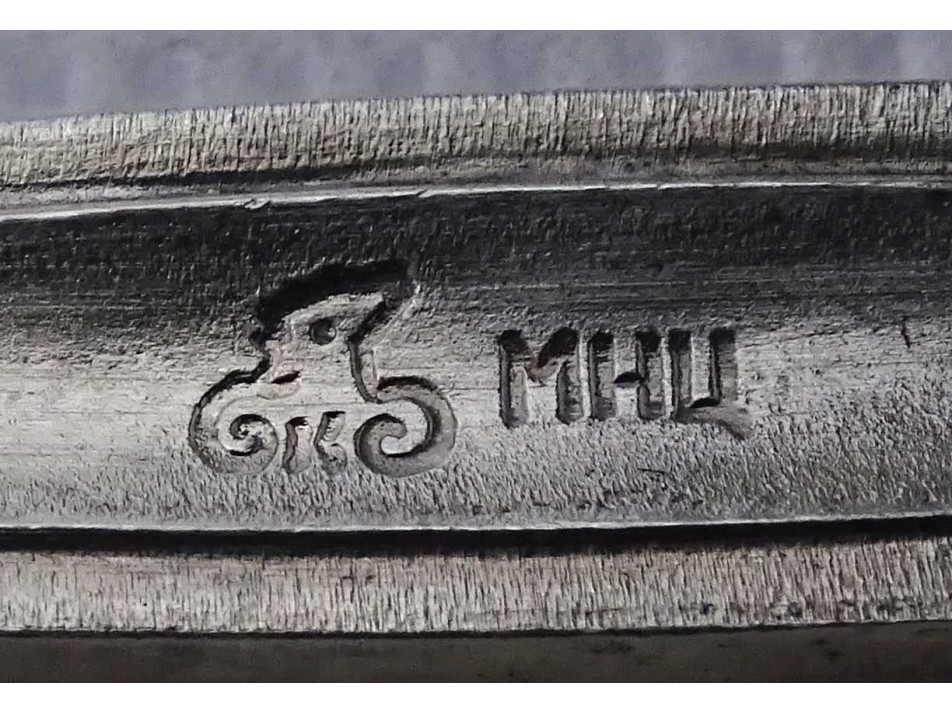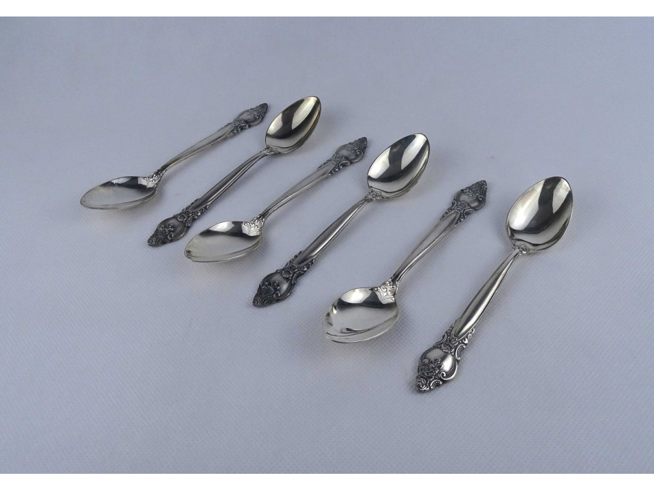 Régi, szép állapotú, vastagon ezüstözött, hat darabos teás kanál, kiskanál készlet. Rajtuk ciril betűs jelzés, lásd fotó: