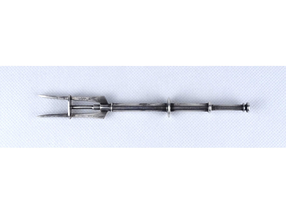 Régi gyönyörű állapotú, jelzett WMF ezüstözött rugós sajtvilla. Ezüstözése hibátlan, kopásmentes. Jelzés a villa fején: WMF 90 (1)